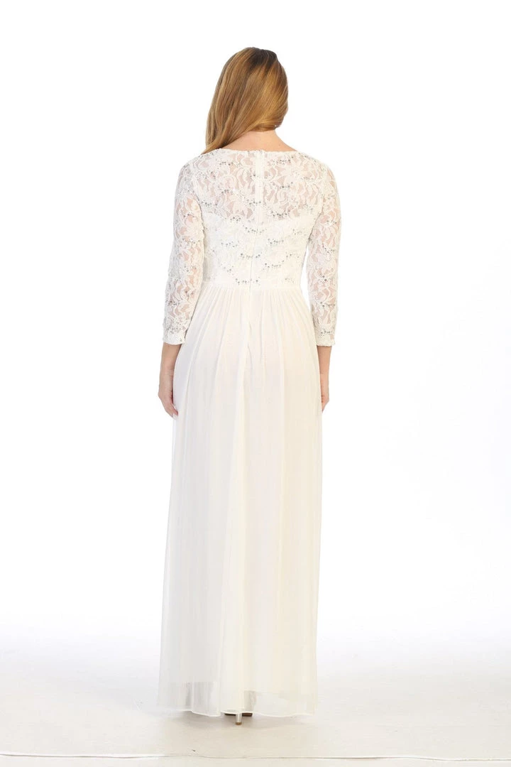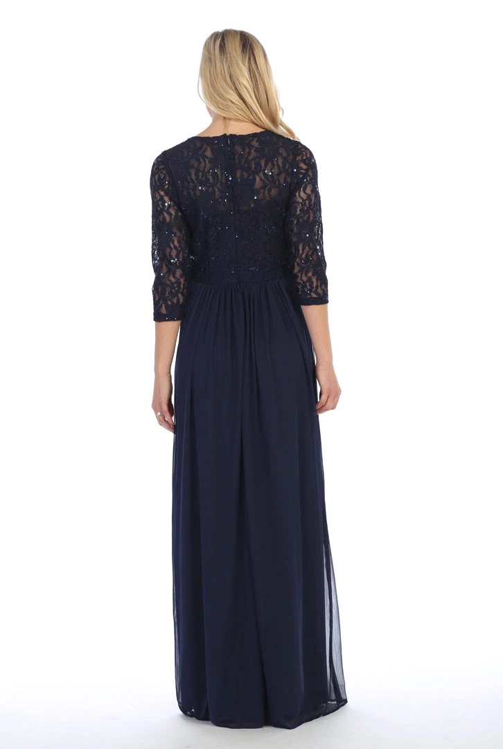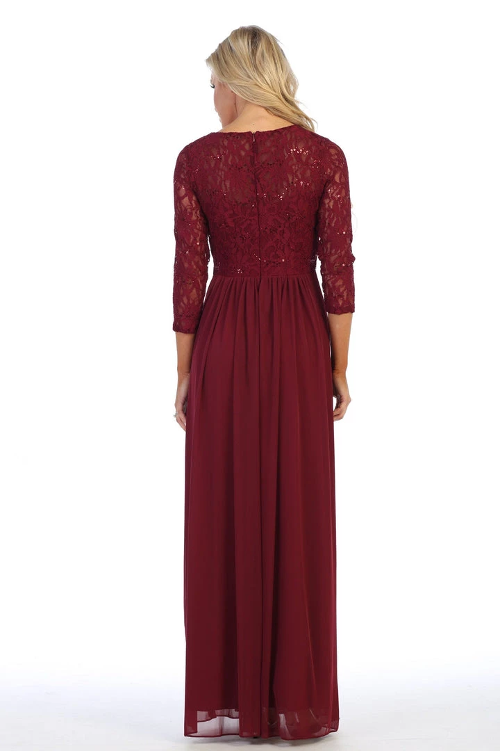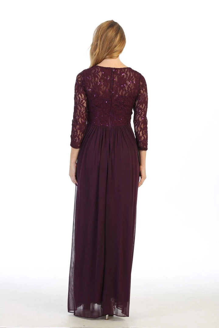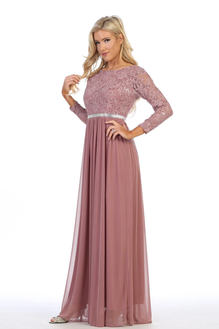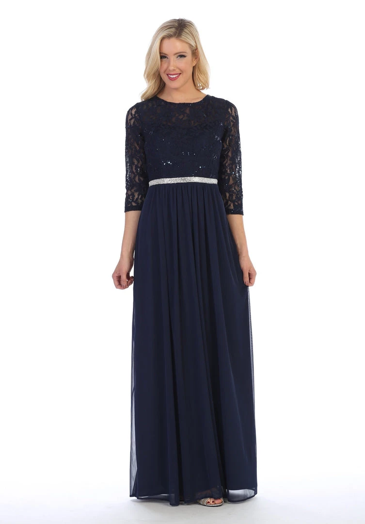 Captivate the room in this long-sleeved evening dress with lace bodice by Celavie 6305L. This beautiful formal gown features a sheer sequined lace bodice with long three-quarter length sleeves, sparkly waistline adorned with rhinestones, floor length chiffon A-line skirt, and a zipper closure. Affordably priced at $149, this long evening dress is perfect for any formal event and will keep you on budget!
