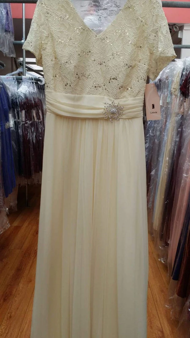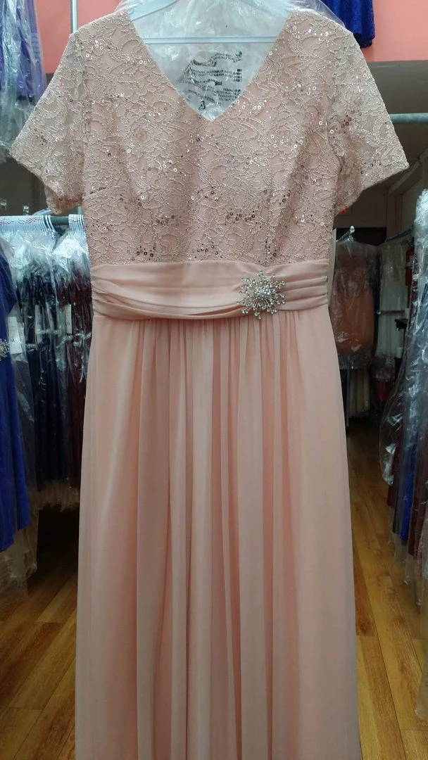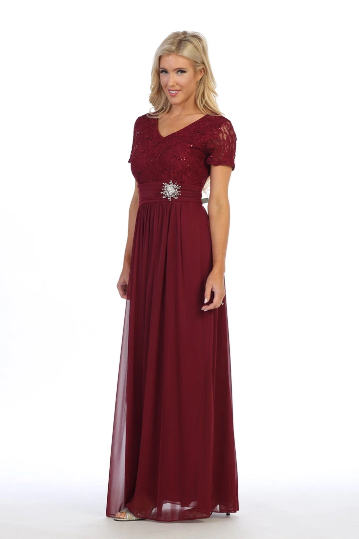 Captivate the room in this short-sleeved evening dress with lace bodice by Celavie 6320L. This beautiful formal gown features a V-neck lace bodice with short sleeves, a ruched satin waistband adorned with a sparkly brooch, modest open V-back, floor length pleated A-line chiffon skirt, and a zipper closure. Affordably priced at $119, this short party dress is perfect for any formal event and will keep you on budget!