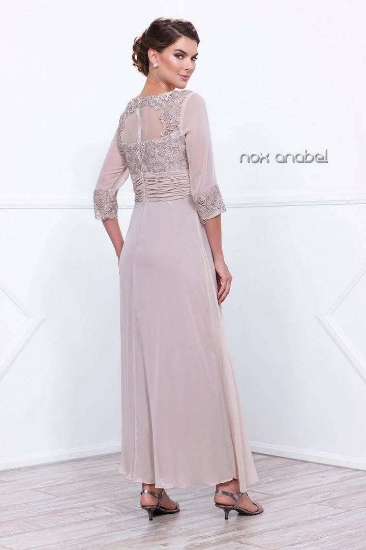 Light up the room in this long lace bodice illusion dress with three-quarter sleeves by Nox Anabel 5101. This long evening gown features a high-neck sleeved bodice with beautiful lace embroidery, sheer illusion neckline, ruched waistband, sheer embellish back, full length skirt that elegantly flows, and a zipper closure. Perfect as a Mother of the Bride dress or for any formal event!