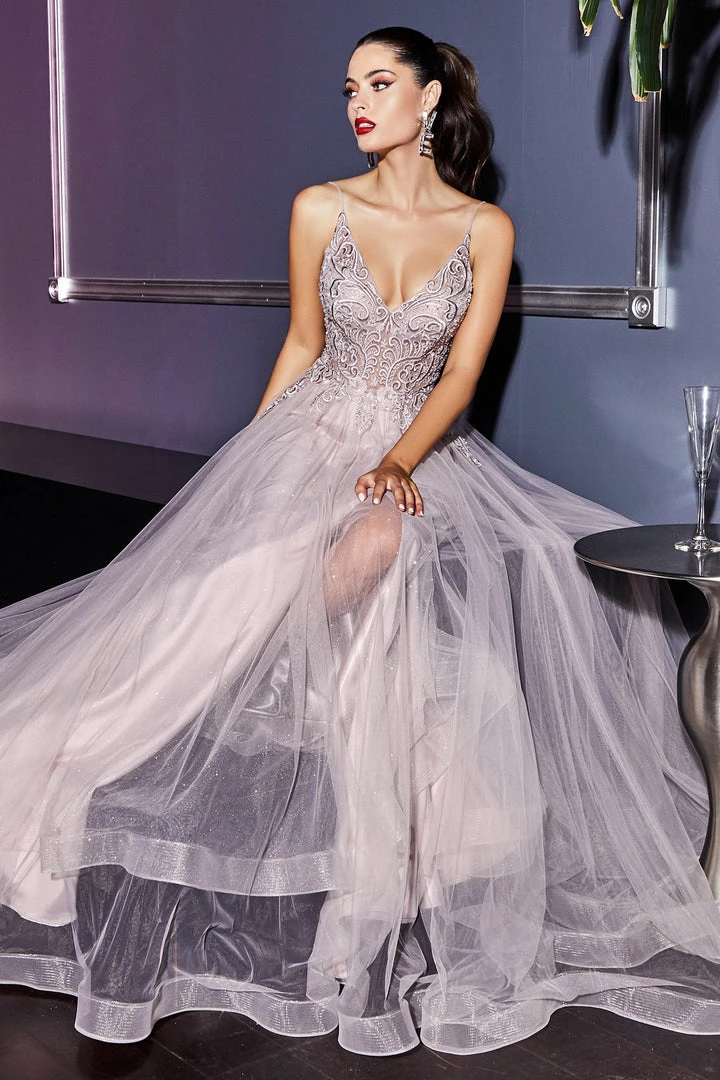Sparkle under the stars in this long A-line glitter tulle dress with lace V-neck bodice by Cinderella Divine KC897.