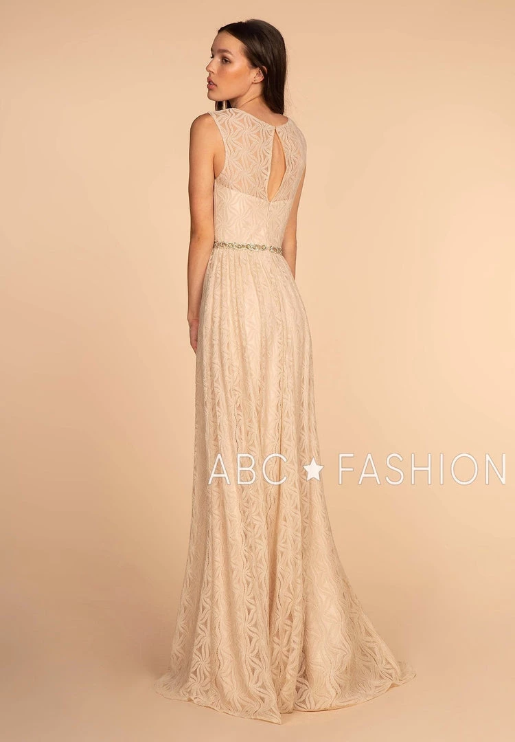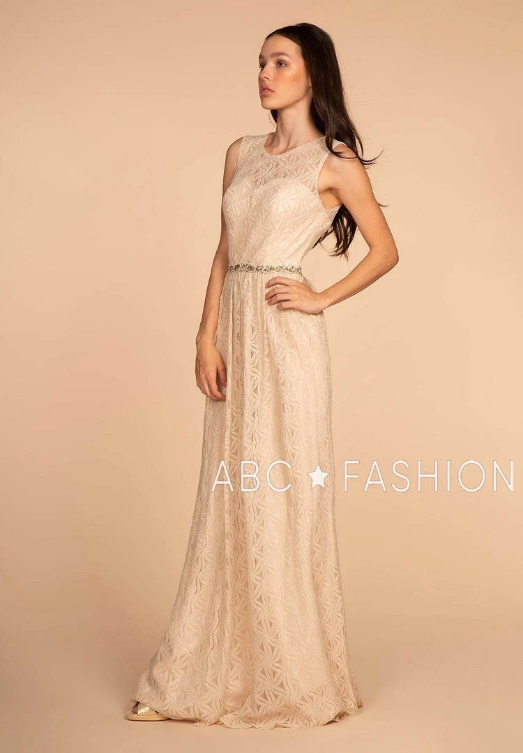 Look sophisticated and elegant in this sleeveless lace gown with jeweled waistband by Elizabeth K GL2611. This long evening dress features a sleeveless lace bodice with an illusion sweetheart neckline, beautiful floral-shaped lace covers this dress, a jeweled band cinches the waistline to create a figure-flattering style, a sheer back with cutout, a floor length A-line skirt, and a zipper closure. Affordably priced under $200, this dress is perfect for any formal event and will keep you on budget!