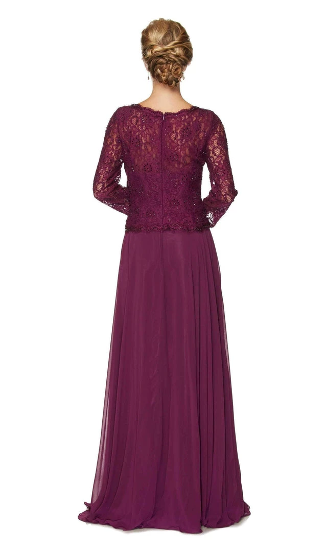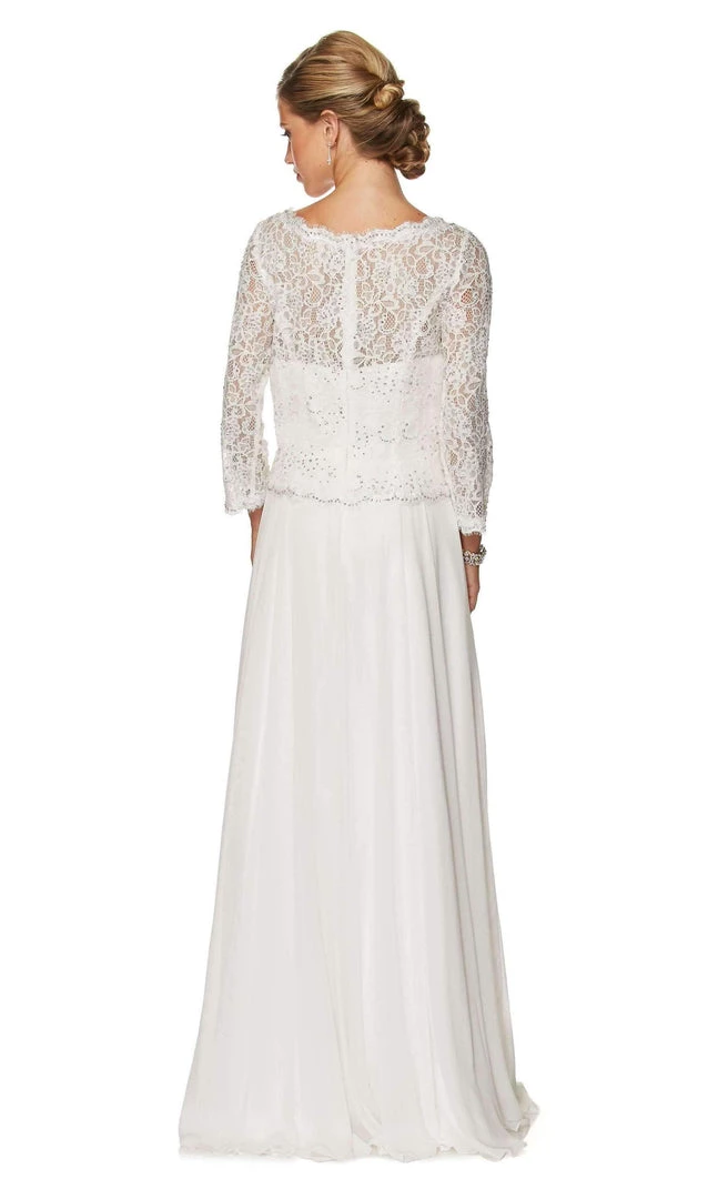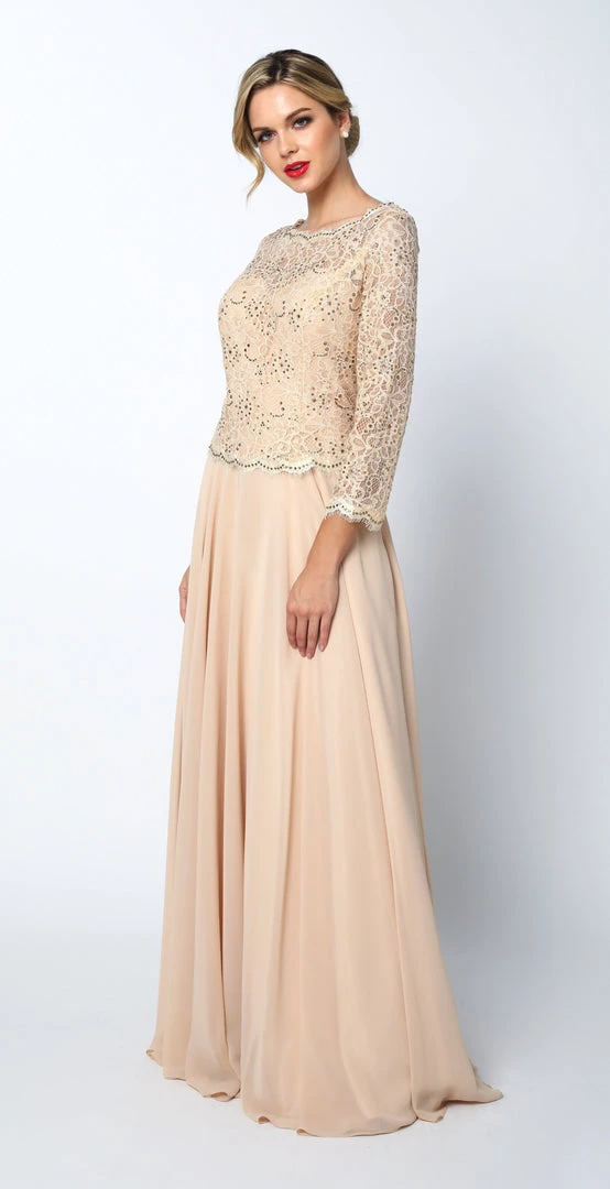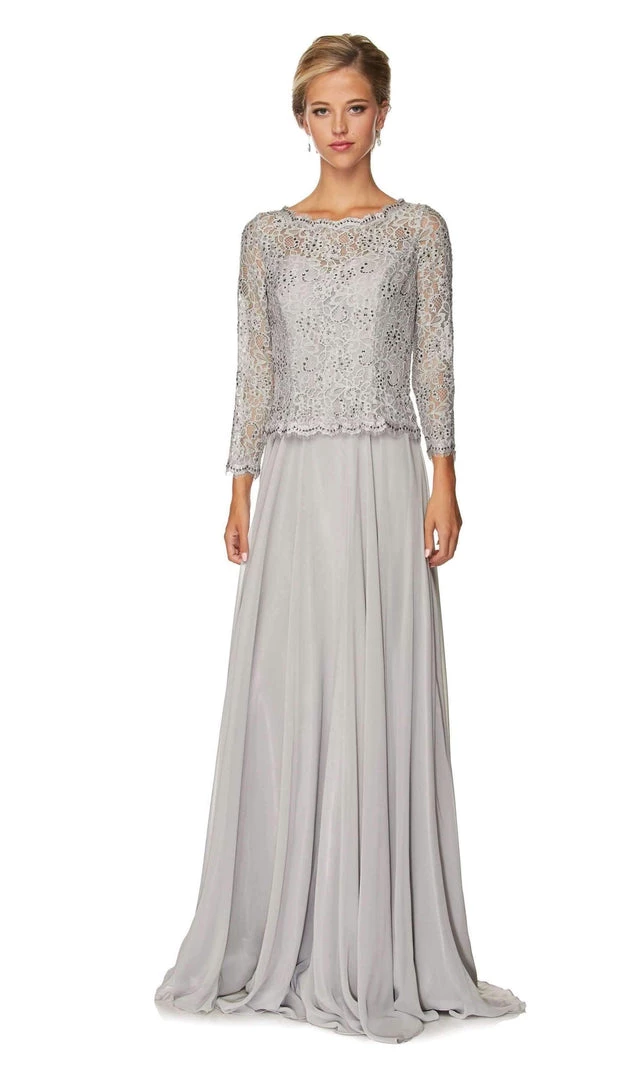 Dance the night away in this long lace top dress with sheer 3/4 sleeves and embellished illusion back by Juliet 630 for any formal event.