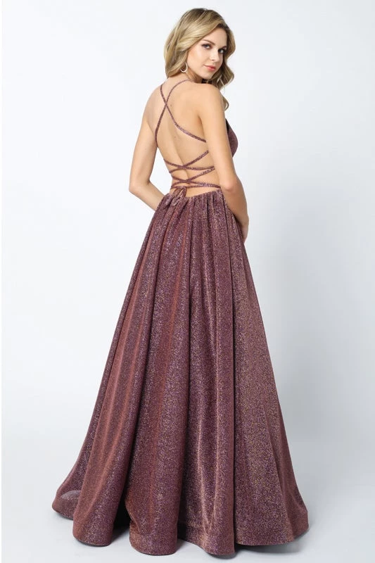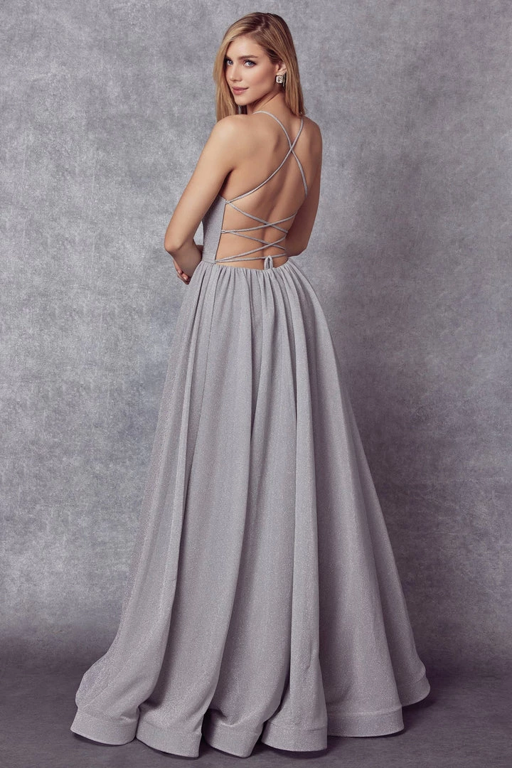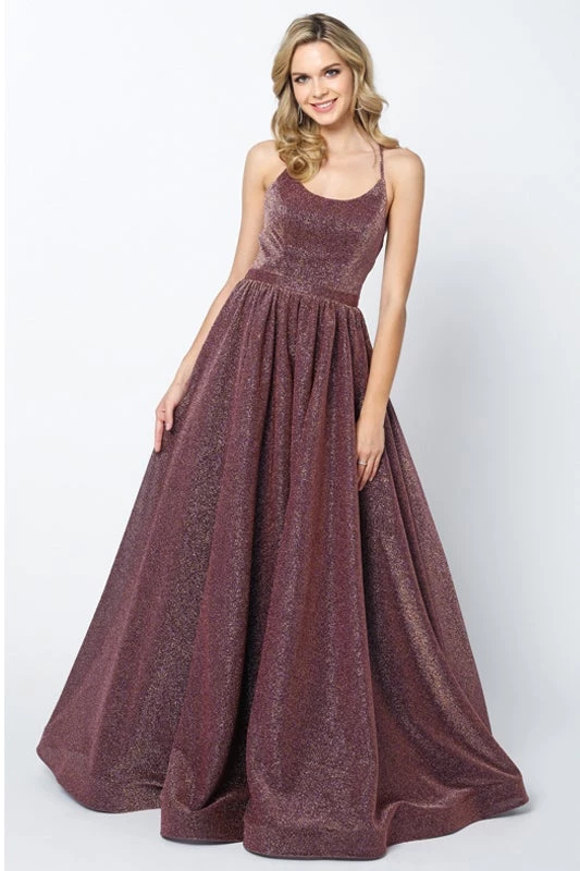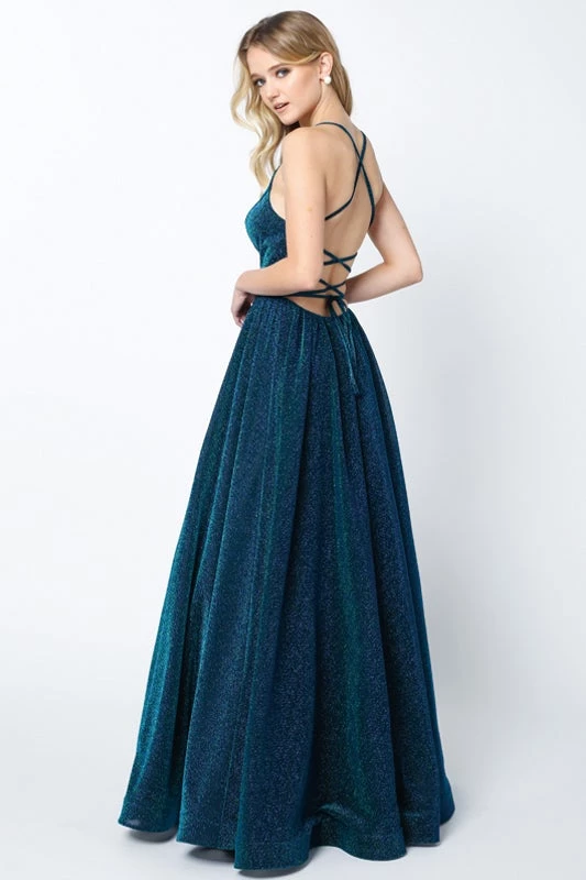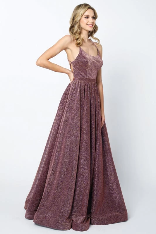 Make lasting memories in this criss cross glitter back ball gown dress with A-line skirt and scoop neck by Juliet 204. This long dress has a scoop neckline and metallic glitter with a lace-up back and adjustable ties.