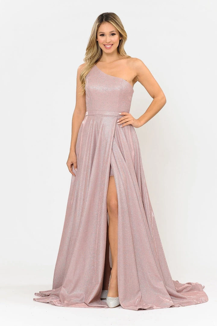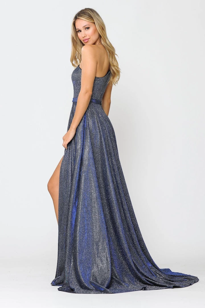 Look picture-perfect in this long A-line metallic glitter one shoulder dress by Poly USA 8430. This beautiful formal gown features an asymmetrical one shoulder bodice, flirty open back, side pockets, floor length A-line skirt with a sweep train and leg slit revealing a short skirt, and a zipper closure. Affordably priced at $260, this long evening dress is perfect for any formal event and will keep you on budget!