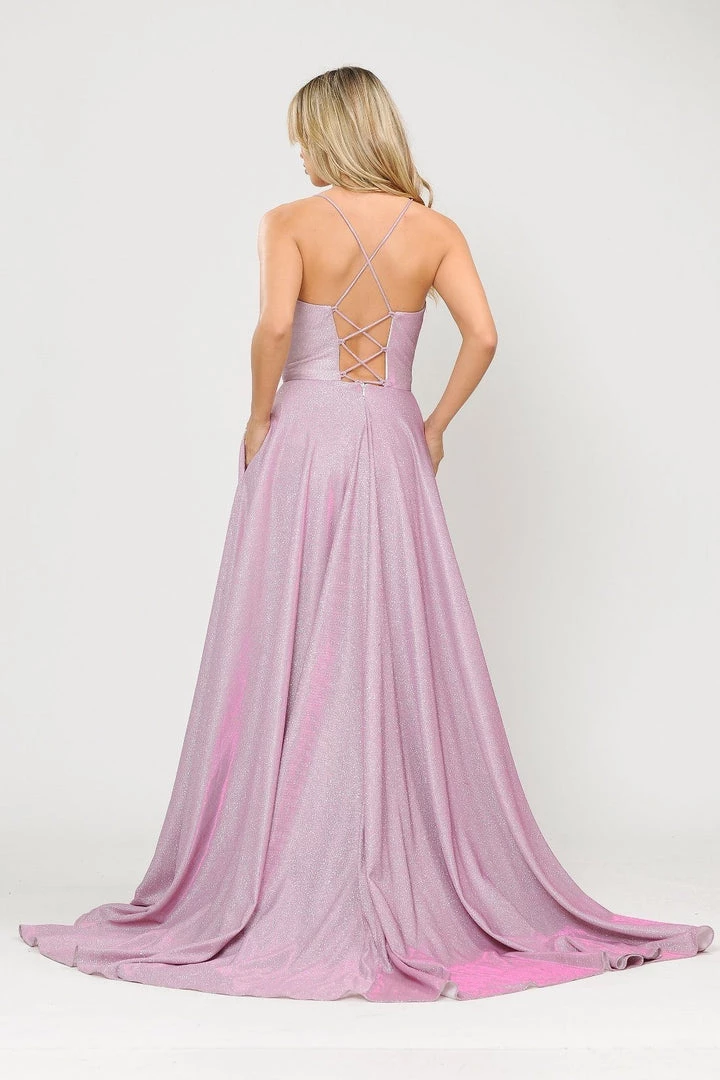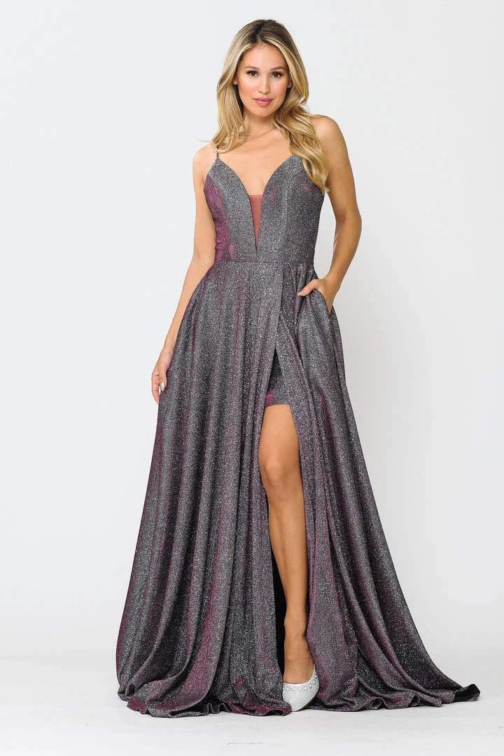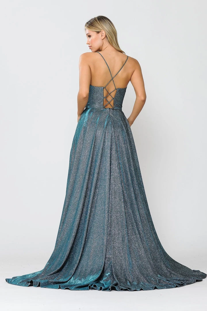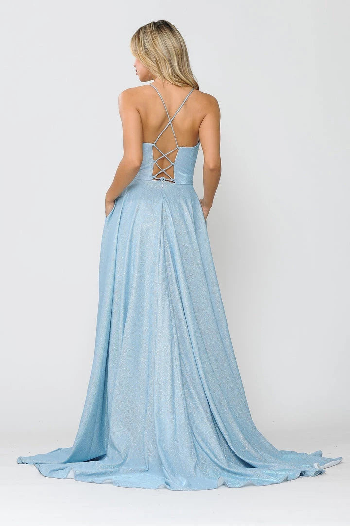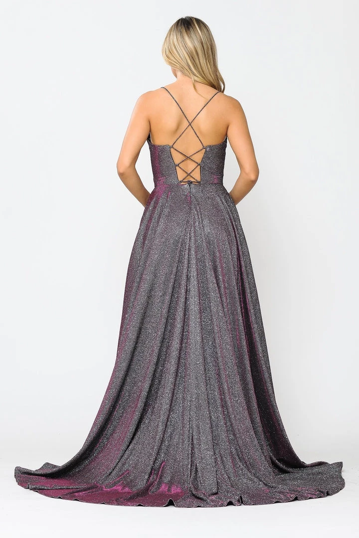 Sparkle under the stars in this long A-line metallic glitter dress with corset back by Poly USA 8692. This beautiful formal gown features a sleeveless illusion deep V-neck bodice secured with spaghetti straps, flirty crisscross open corset back, side pockets, floor length A-line skirt with a sweep train and leg slit revealing a short skirt, and a lace-up back. Affordably priced at $260, this long evening dress is perfect for any formal event and will keep you on budget!