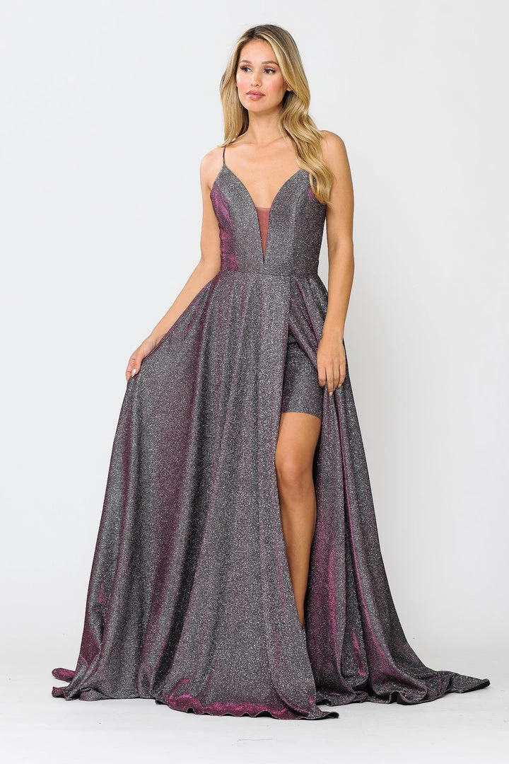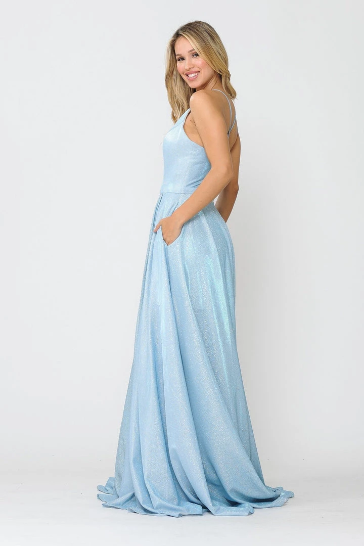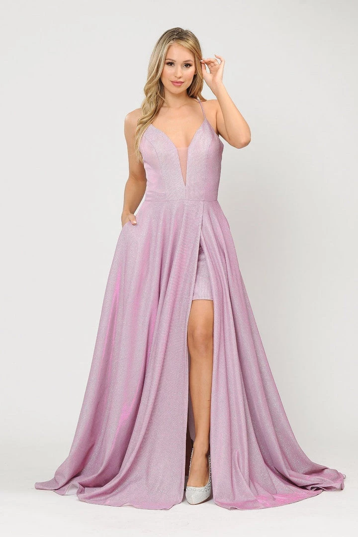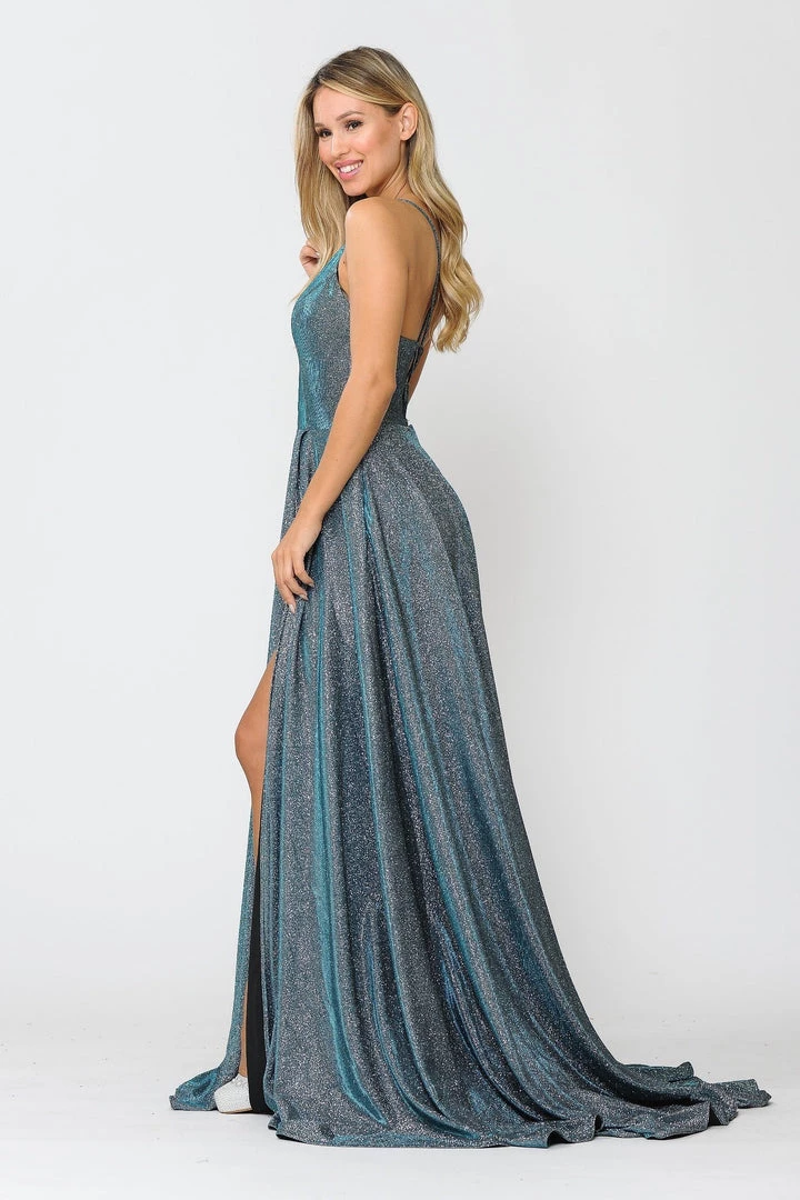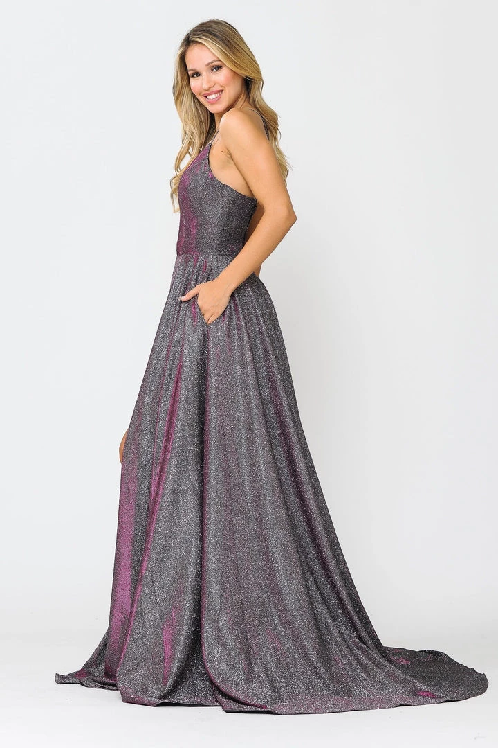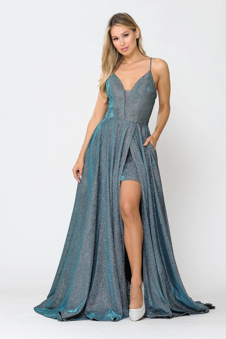 Sparkle under the stars in this long A-line metallic glitter dress with corset back by Poly USA 8692. This beautiful formal gown features a sleeveless illusion deep V-neck bodice secured with spaghetti straps, flirty crisscross open corset back, side pockets, floor length A-line skirt with a sweep train and leg slit revealing a short skirt, and a lace-up back. Affordably priced at $260, this long evening dress is perfect for any formal event and will keep you on budget!