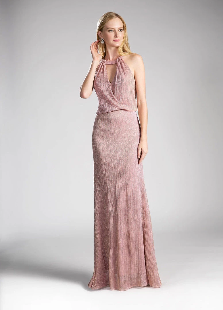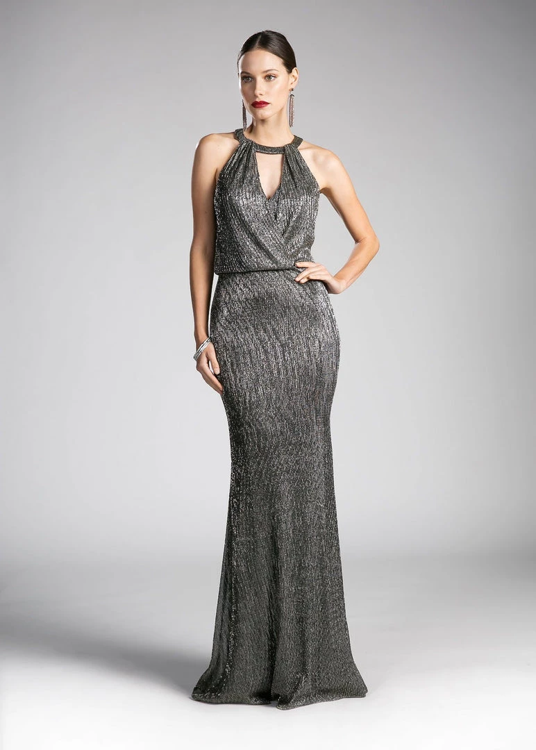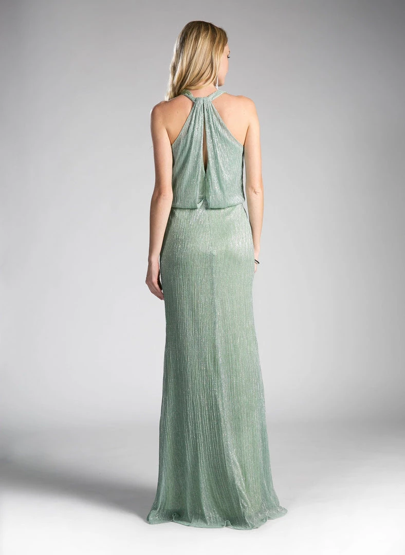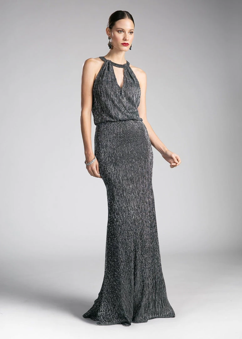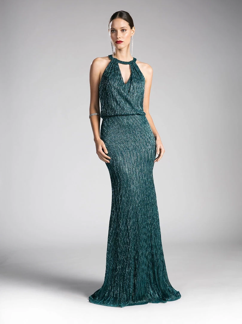 Enjoy your night in this long sleeveless V-neck metallic knit dress with collar by Cinderella Divine CH557. This evening gown features a sleeveless V-neck bodice with cut-in shoulder, a trendy choker collar, floor length fitted skirt, and a zipper closure.