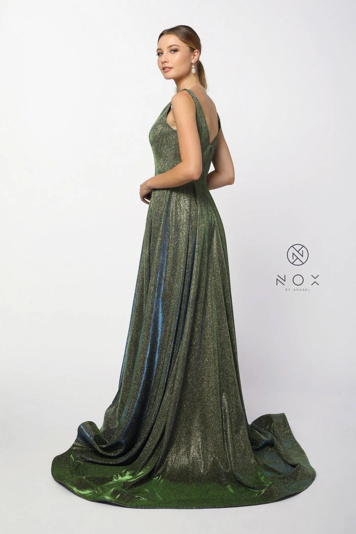 You’ll love twirling around in this shimmering long iridescent metallic V-neck dress with illusion V-neckline by Nox Anabel R274.