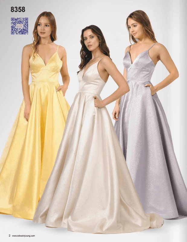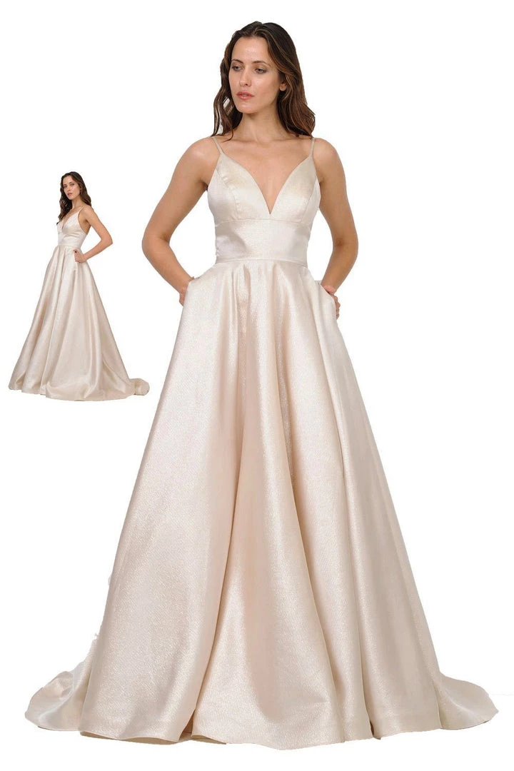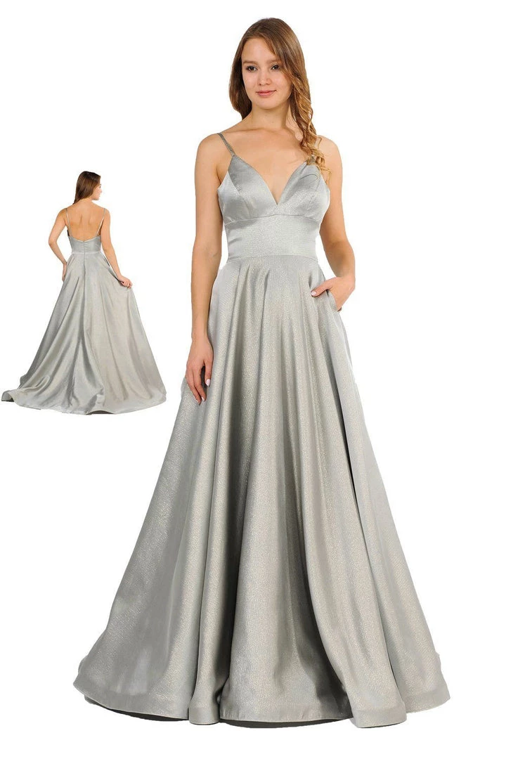 Look elegant and chic in this long V-neck metallic dress with open back by Poly USA 8358. This beautiful formal gown features a sleeveless bodice with a wide waistband, flirty open back, side pockets, floor length A-line skirt with horsehair hemline with a small train, and a zipper closure. Affordably priced at $220, this long evening dress is perfect for any formal event and will keep you on budget!