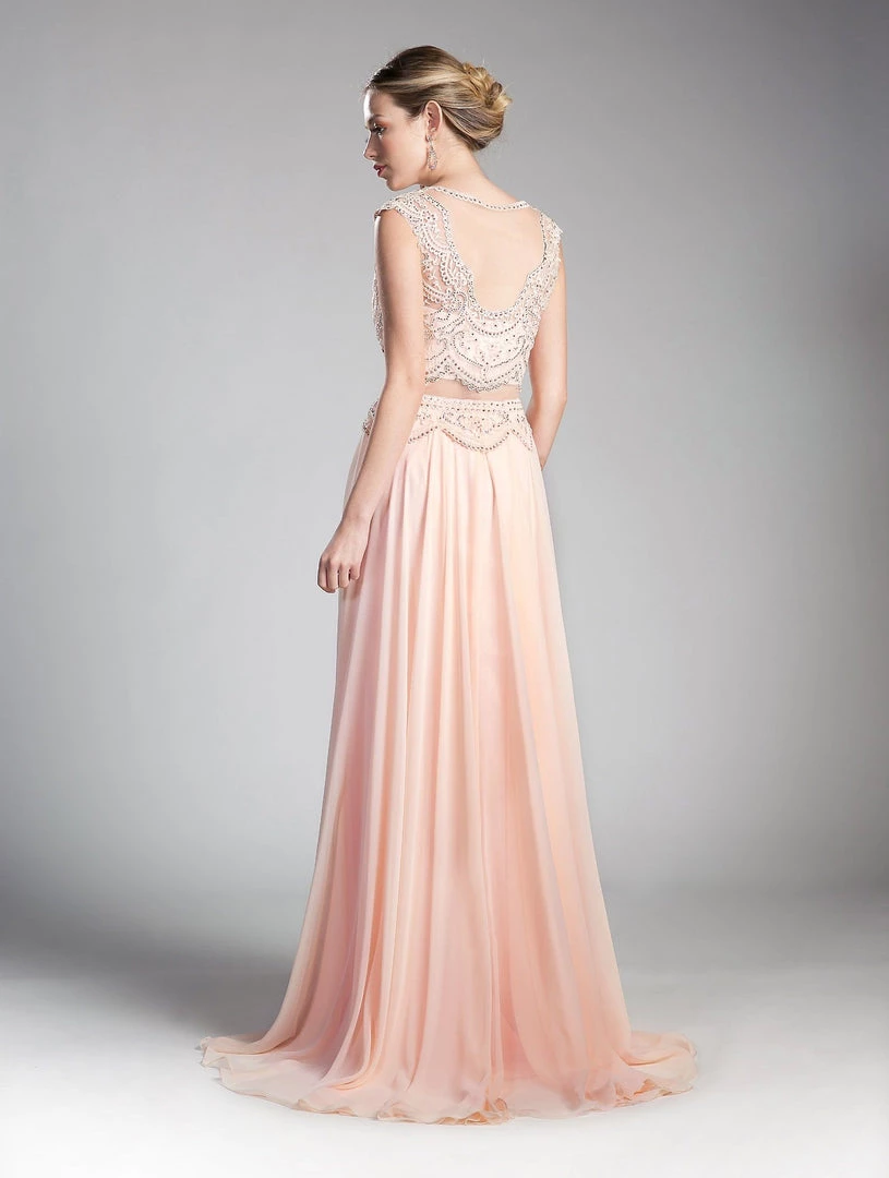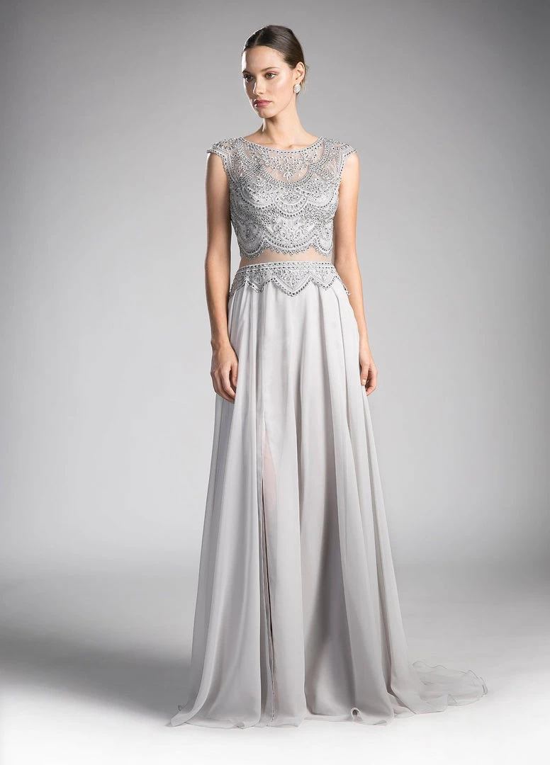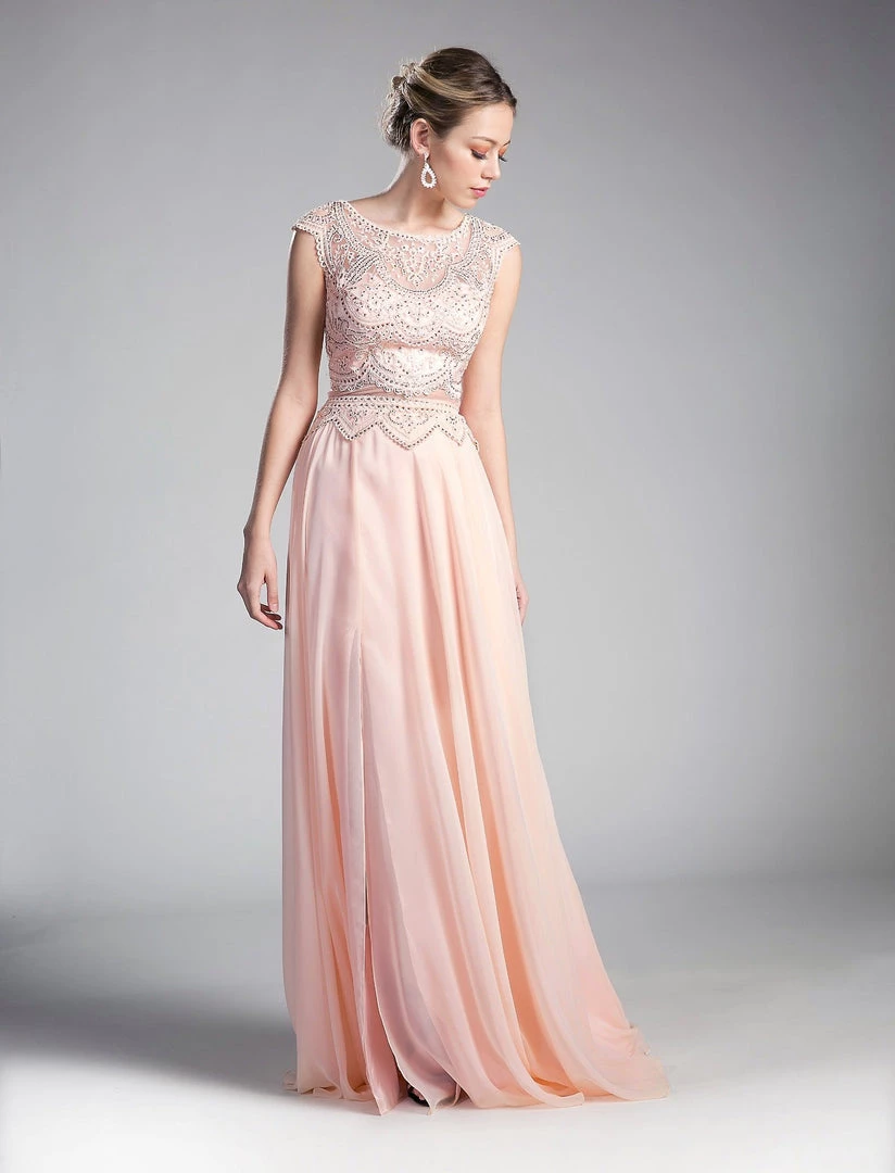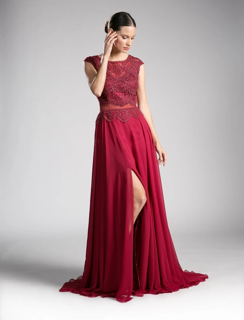 Command attention in this long mock two-piece formal dress with cap sleeves by Cinderella Divine CD0113. This evening gown features a cap-sleeved illusion bodice with adorned beaded appliques, sheer midriff, embellished sheer back, floor length A-line skirt with side slit, and a zipper closure.
