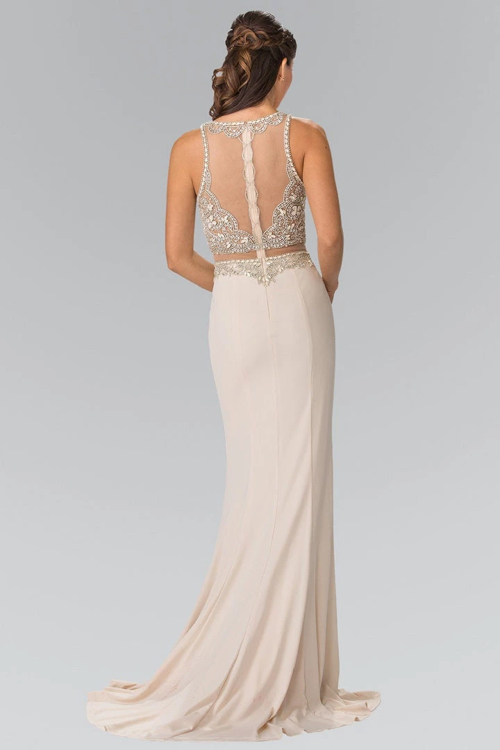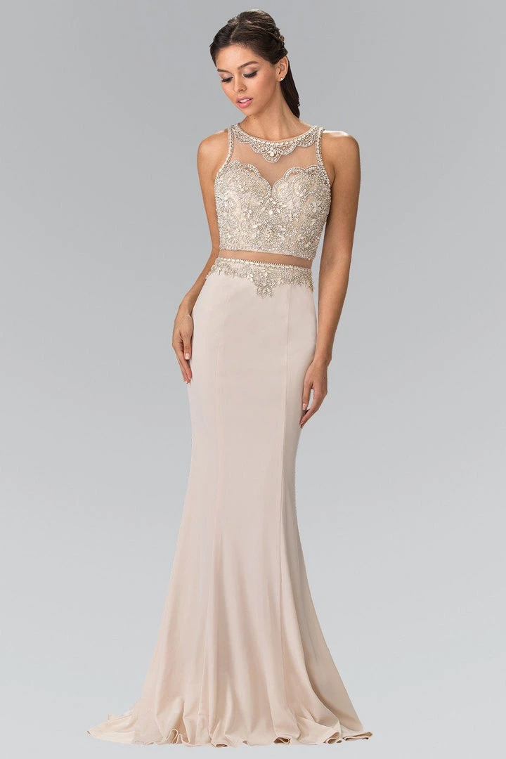 Think of how amazing you’ll look in this long mock two piece dress with beaded top by Elizabeth K.