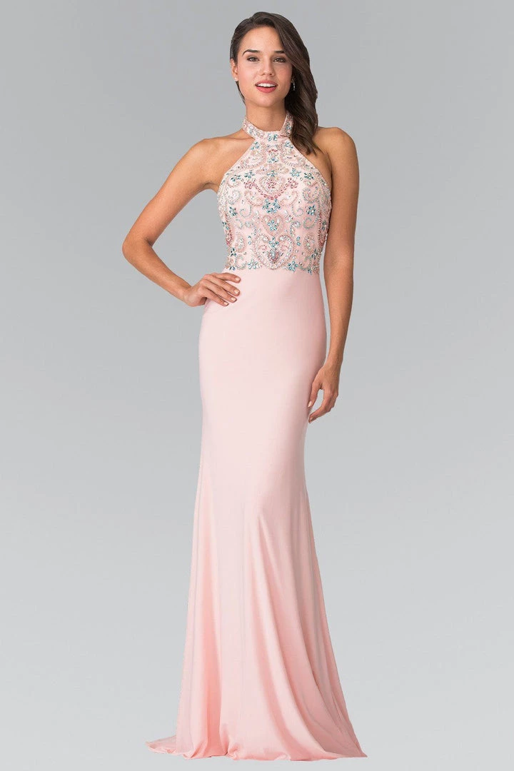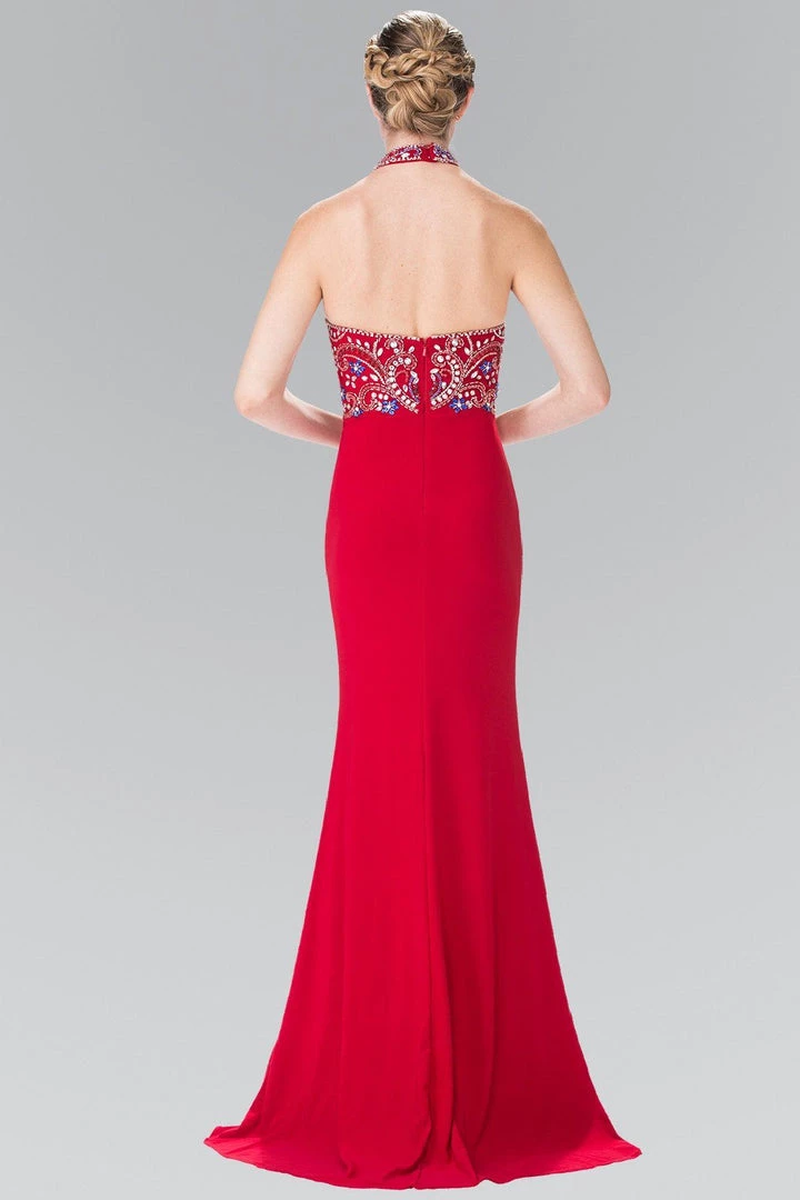 You’ll be the life of the party in this long multi color beaded illusion halter dress by Elizabeth K.