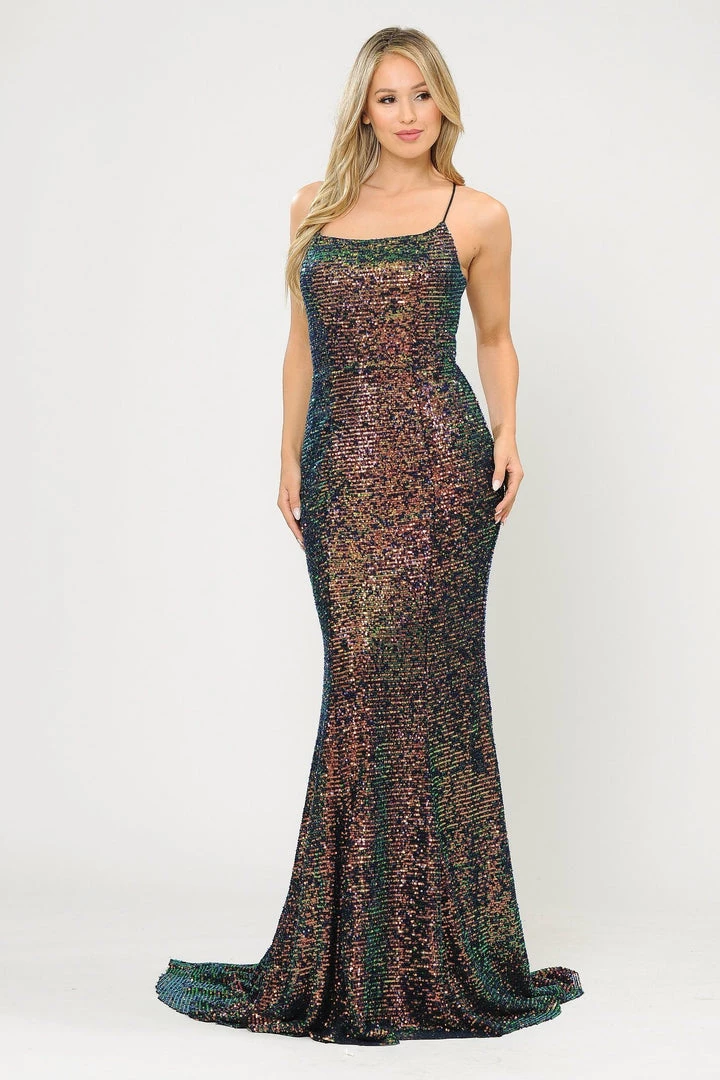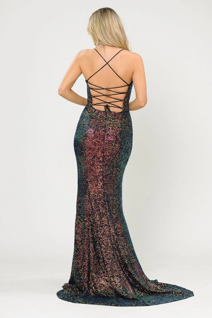 Look breathtaking in this long multi-color sequin mermaid dress with corset open back by Poly USA 8516. This beautiful formal gown features a sleeveless square neck bodice supported with spaghetti straps, flirty crisscross open corset back, floor length trumpet skirt with a sweep train, and a lace-up back.