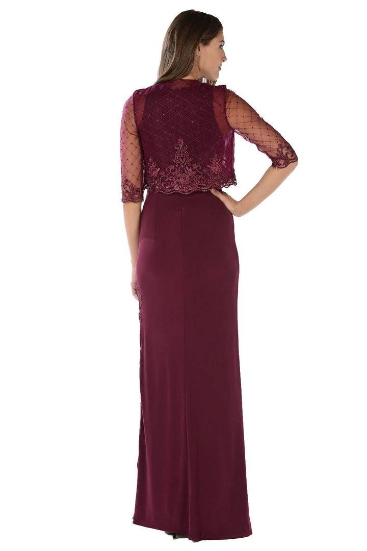 Look chic yet modest in this long navy blue dress with embellished sheer bolero jacket by Poly USA 7596. This long evening dress features a sleeveless bodice with side lace appliques. An eye-catching bead embroidered mid-sleeve bolero jacket, a full-length skirt, and a zipper closure complete this beautiful look. Perfect as a mother of the bride dress or for any formal event!