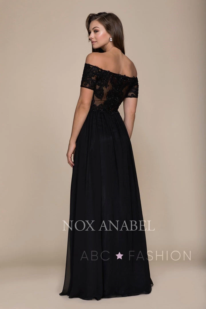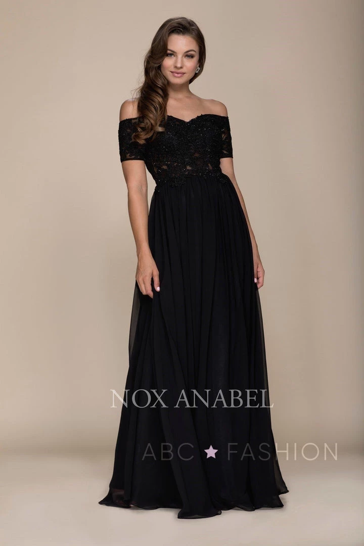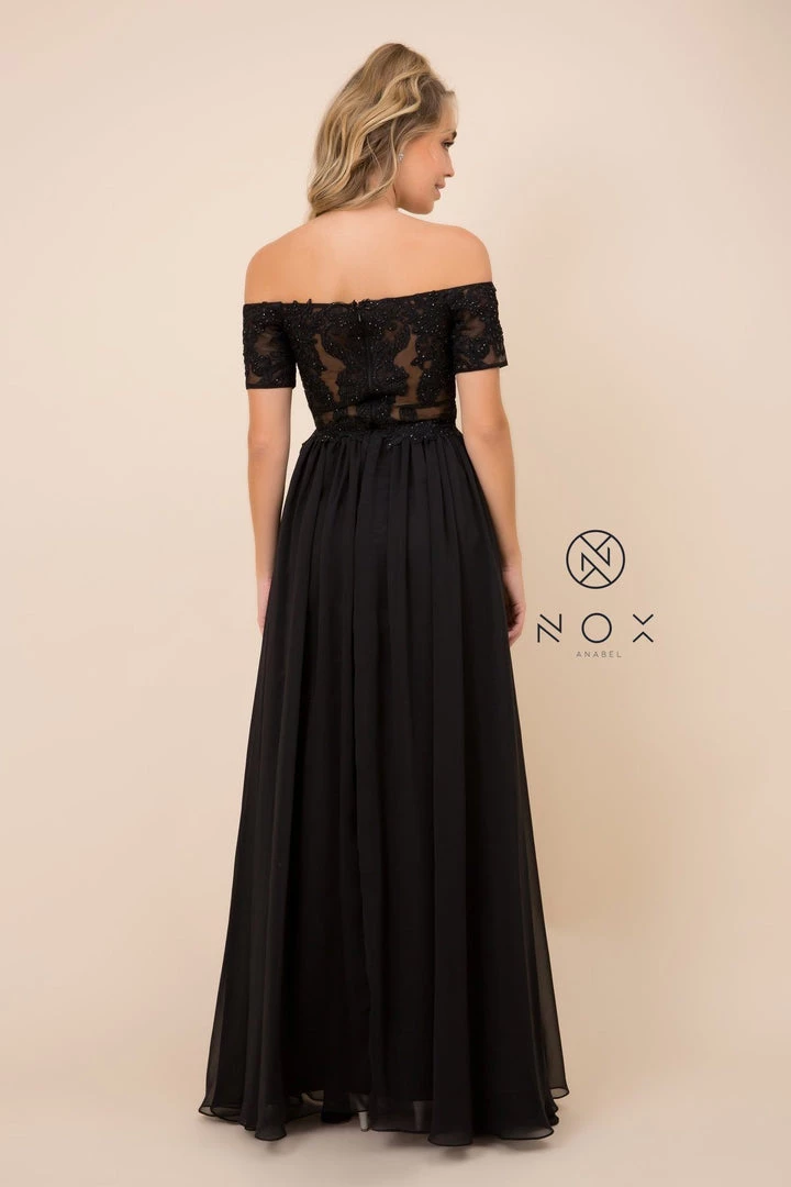 Turn heads in this A-line off the shoulder chiffon gown by Nox Anabel A061. This evening dress features a beautiful beaded lace off the shoulder bodice, embellished sheer back, full length A-line skirt, and a zipper closure.