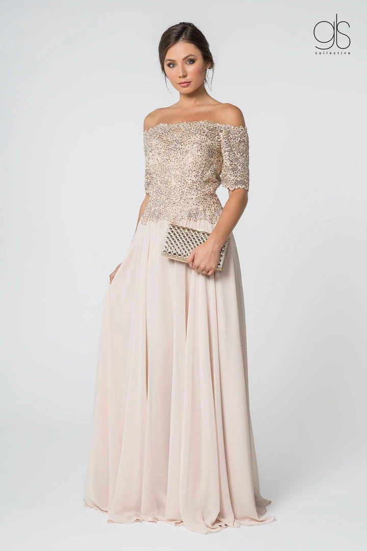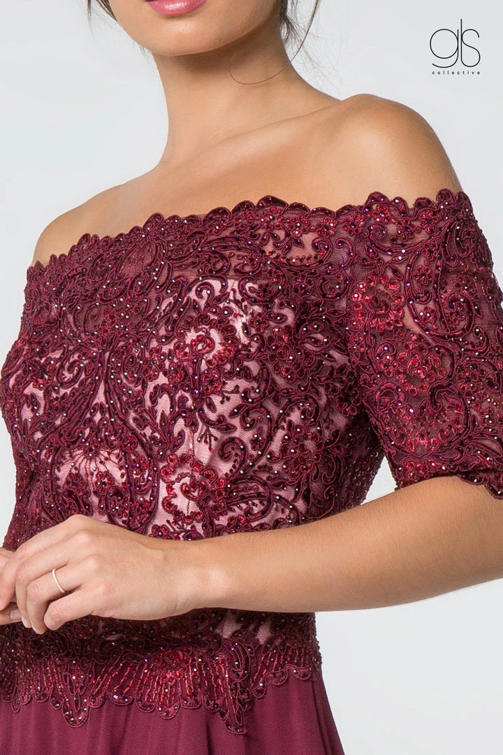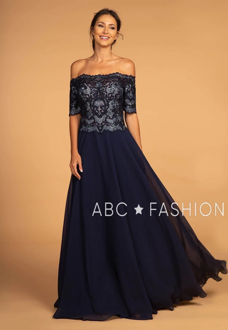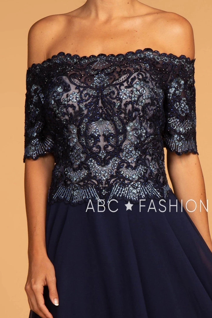 Look romantic and chic in this navy blue off the shoulder gown with embroidered bodice by Elizabeth K GL2525. This long evening dress features a beautiful off shoulder bodice adorned with beautiful floral embroidery that cascades to the waistline, short embellished sleeves, a floor length A-line chiffon skirt, and a zipper closure. Affordably priced under $300, this dress is perfect for any formal event and will keep you on budget!