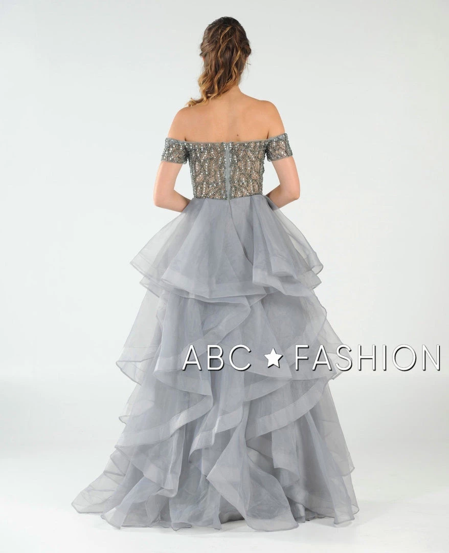 Make an impact in this off the shoulder gown with tiered skirt by Poly USA 8006. Beautiful off shoulder tulle dress with a gorgeous beaded bodice, sheer beaded back, floor length tiered skirt with horsehair hemline ruffles, and a zipper closure. Affordably priced under $300, this dress is perfect for any formal event and will keep you on budget!