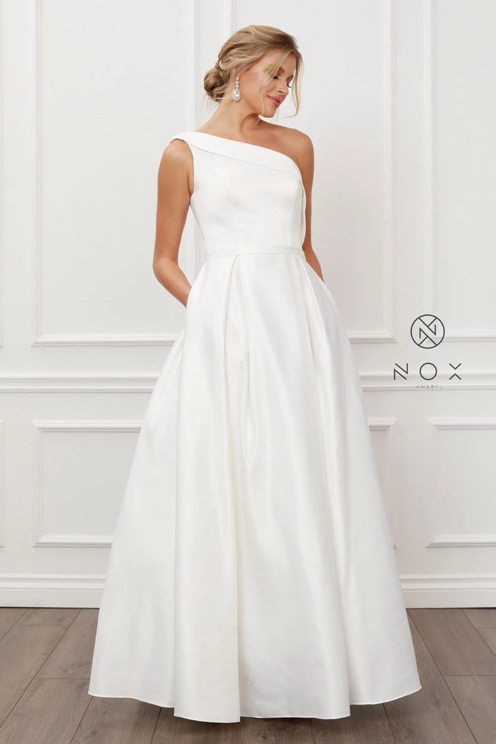 Dance the night away in this A-line one shoulder gown by Nox Anabel E469. Made out of satin, this long asymmetrical dress features a fitted one shoulder bodice, open back, a floor length A-line skirt with side pockets, and a zipper closure.