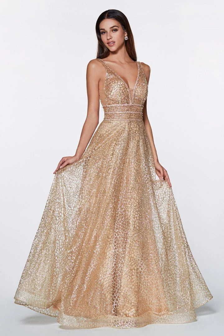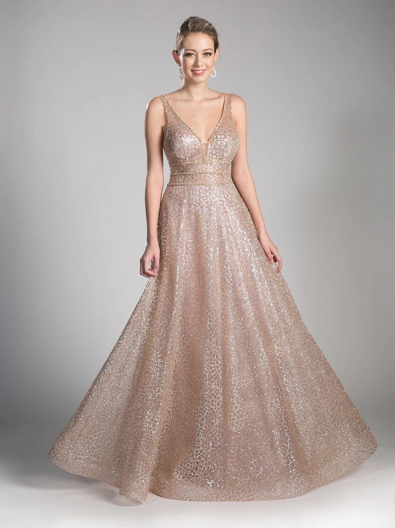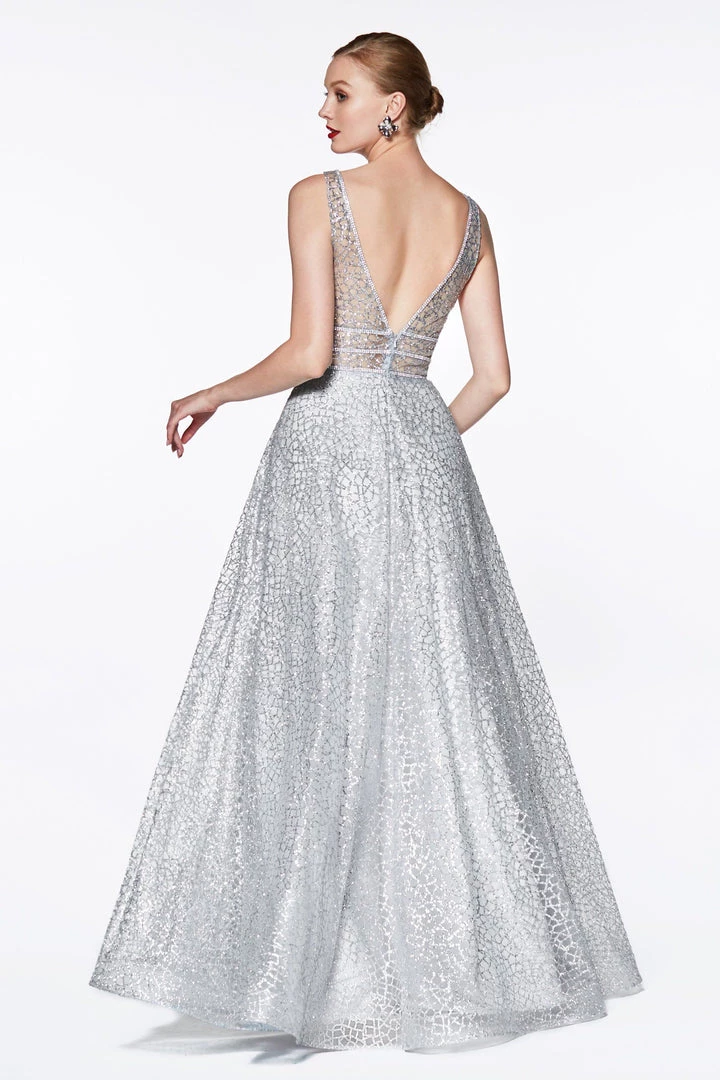 Dance the night away in this long formal glitter A-line dress with open back by Cinderella Divine CJ256. This evening gown features a V-neckline sleeveless bodice secured with a sheer illusion panel, this dress is covered in glittery sequins accented with rhinestones, a flirty open V-shaped back with accented with beads, a floor length A-line skirt, and a zipper closure.