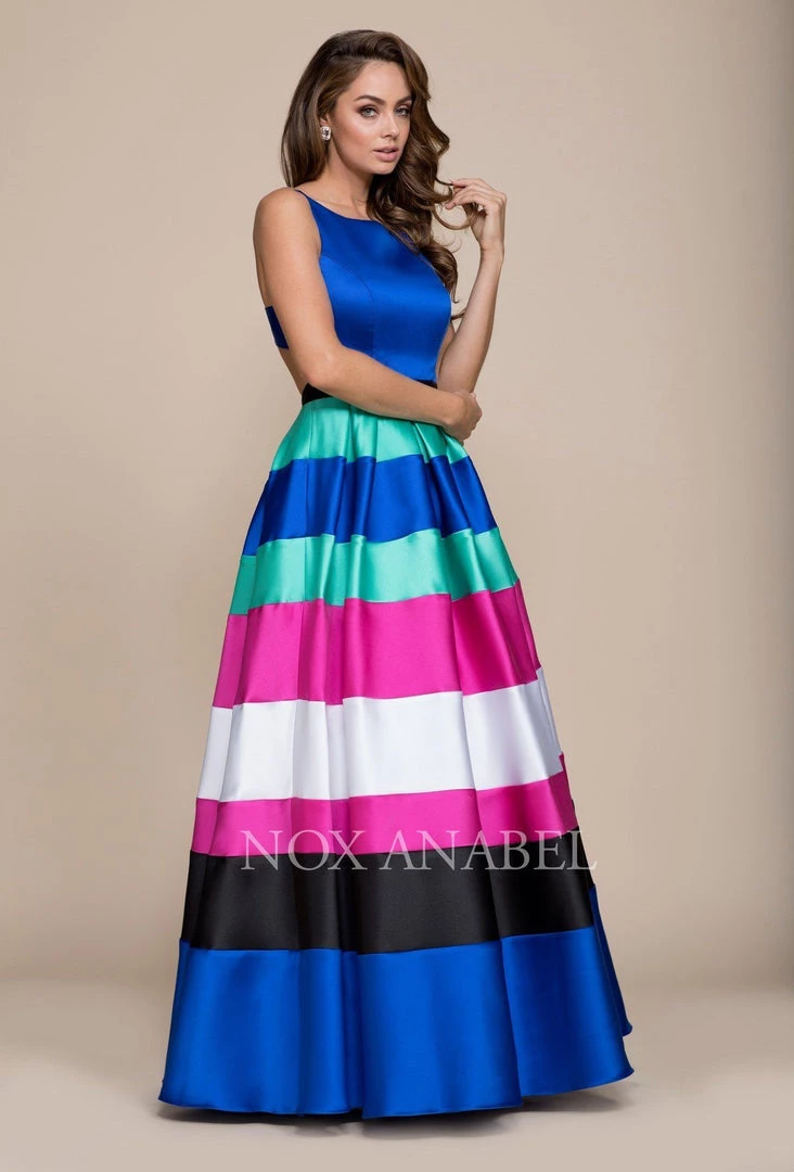 Look fabulous wearing this long blue two-piece crop top dress with multi-colored striped skirt by Nox Anabel 8350 at your upcoming formal event. This long evening gown features blue sleeveless crop-top, long multi-colored striped skirt, flirty open back, and a zipper closure. Affordably priced under $200, this dress is perfect for any formal event and will keep you on budget!