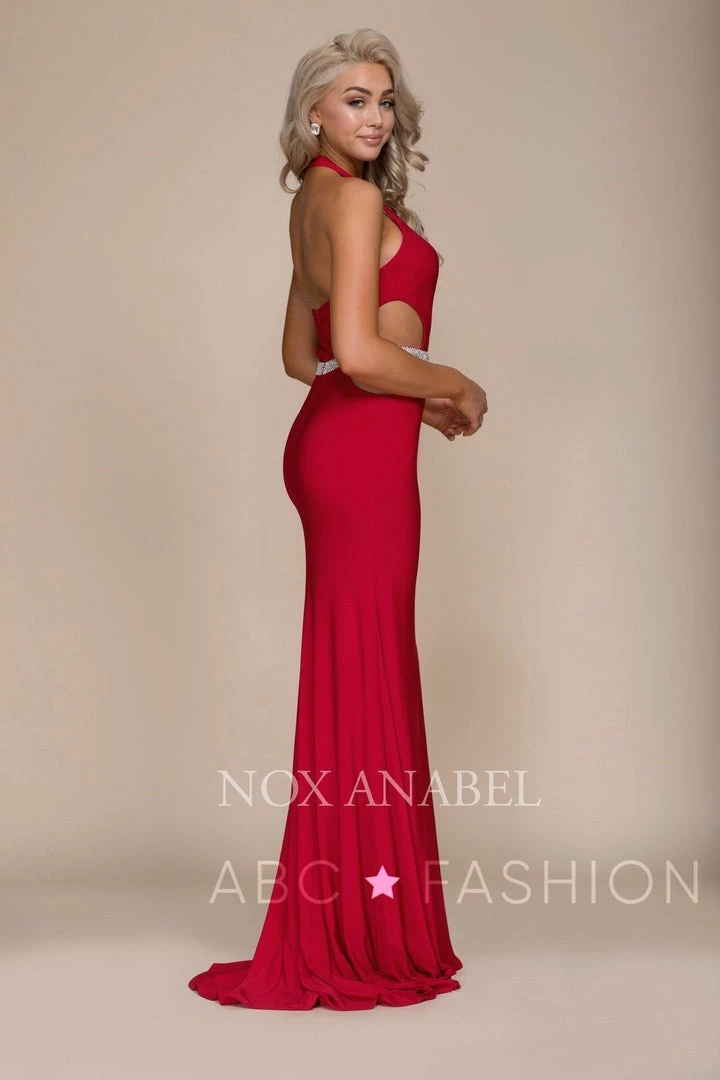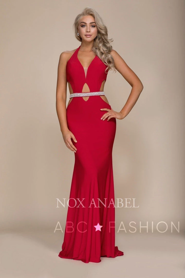 Dazzle the room in this V-neck halter dress with beaded waistline by Nox Anabel A046. This evening gown features a V-neck halter bodice secured by a sheer inset panel, beaded waistline defined with sexy waist cutouts, the full length skirt flares to the floor forming a gorgeous sweep train, and a zipper closure. Perfect for any formal event!