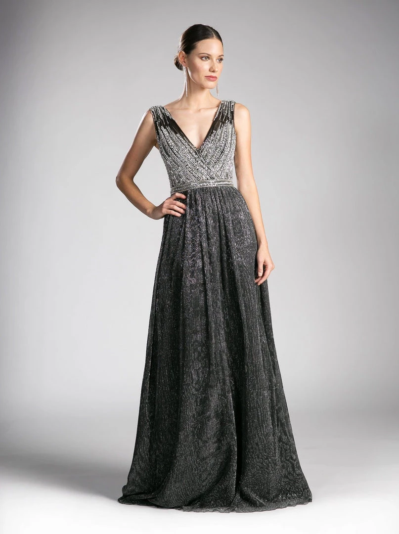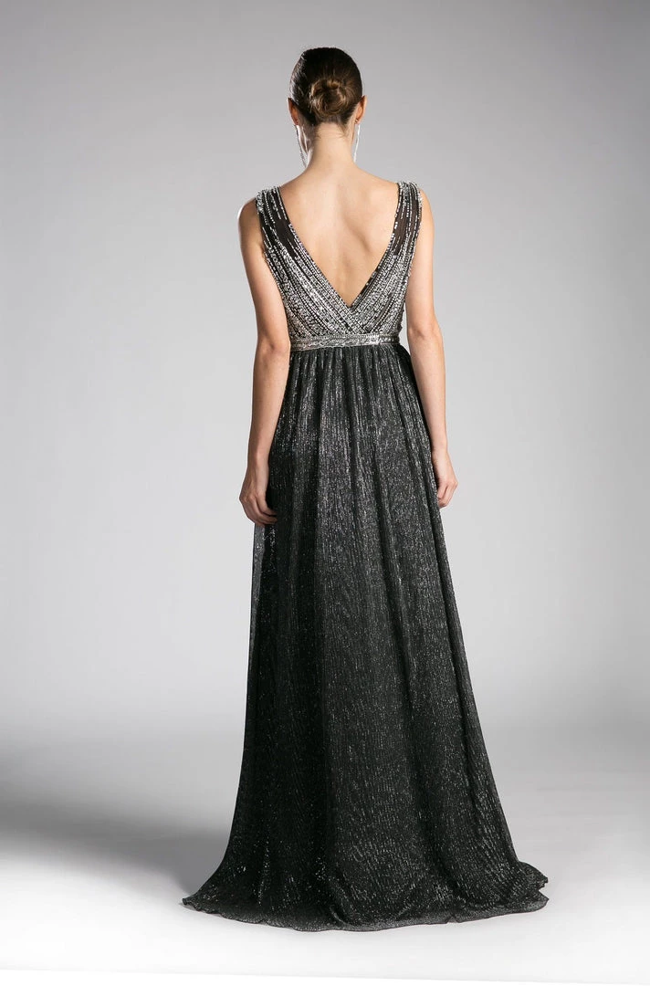 Look gorgeous in this long beaded black dress by Cinderella Divine 8269. This evening gown features a beautiful sleeveless bodice with a deep V-neckline adorned with sparkling rhinestone beads, a plunging open V-back, a floor length A-line skirt, and a zipper closure.