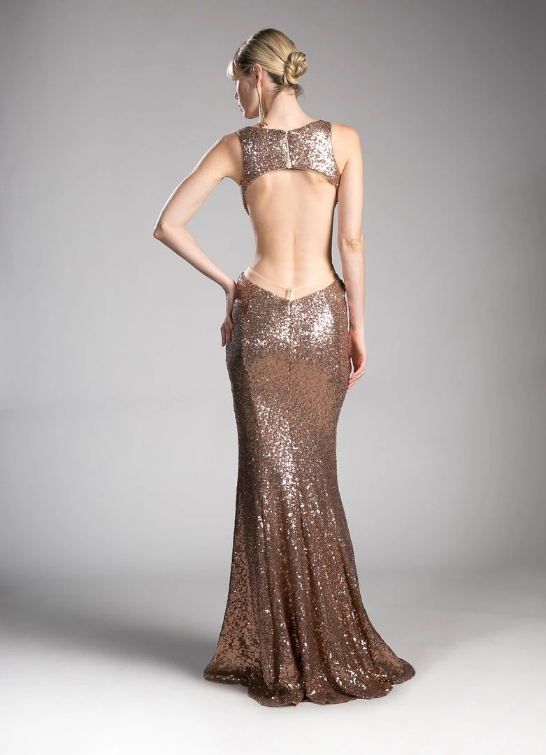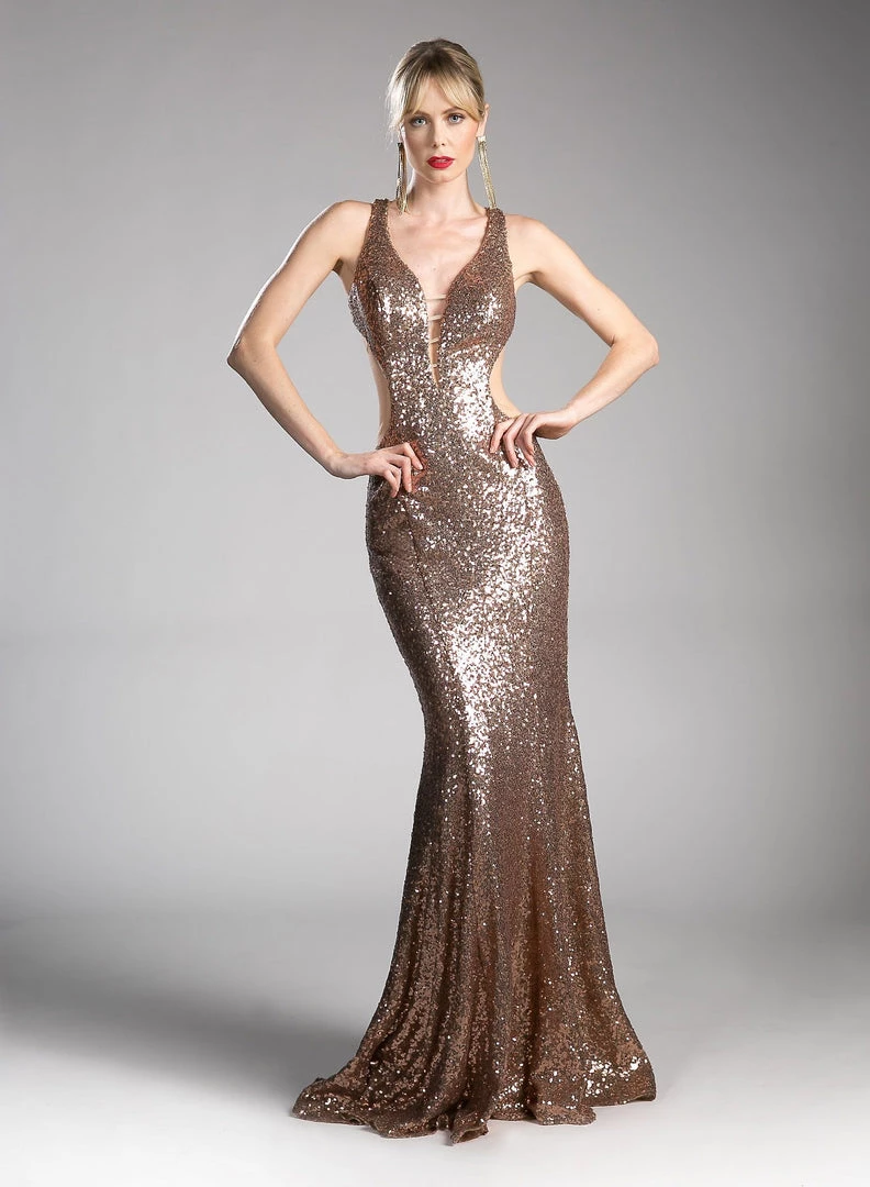Light up the room in sexy this long sequined formal dress with plunging V-neckline by Cinderella Divine CR815. This evening gown features a sleeveless deep V-neck bodice secured by two sheer straps, sparkly sequins are adorned all throughout this form-fitting dress, flirty cut out open back, a floor length fitted skirt with a short train, and a zipper closure.