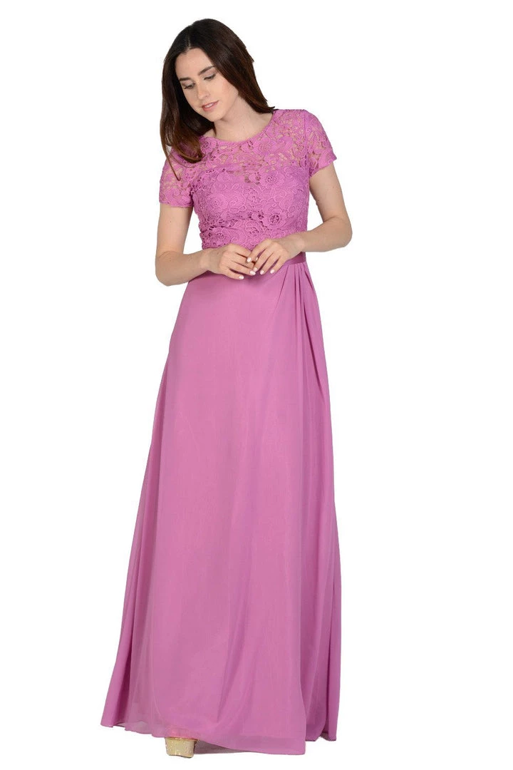 Look sophisticated in this long orchid dress with short-sleeved lace bodice by Poly USA Style Number 7592. This long evening dress features a lovely lace bodice with short sleeves. An eye-catching gathered skirt, satin waistband, a full-length chiffon skirt, and a zipper closure complete this beautiful look. Perfect as a mother of the bride dress or for any formal event!