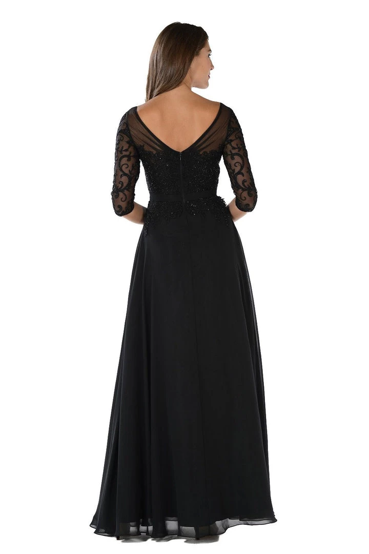 Look chic yet modest in this long dusty rose pink dress with embellished sheer lace mid-sleeves by Poly USA 7598. This long evening dress features a lace appliqued bodice that’s accented with beads and sheer mid-sleeves. An eye-catching embellished V-back, a full-length skirt, and a zipper closure complete this beautiful look. Perfect as a mother of the bride dress or for any formal event!