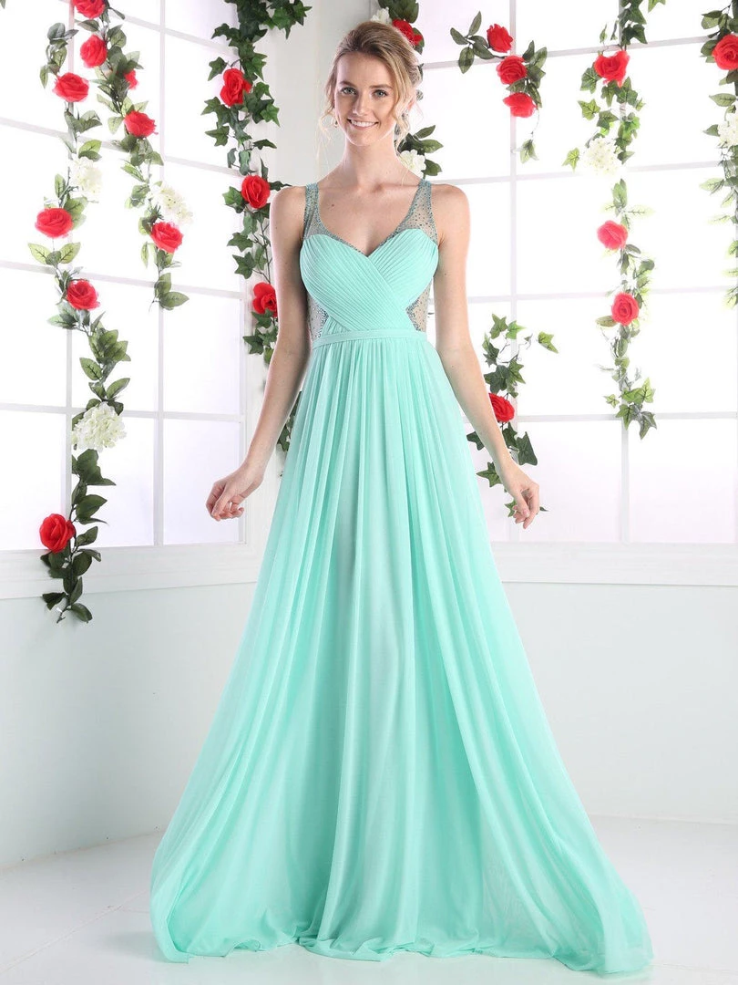 Think of how amazing you’ll look in this long pleated dress with beaded sheer straps by Cinderella Divine 5061. Shimmery beads detail the sheer strap, the waist and extends to the sheer V-back of the pleated sweetheart bodice. Flowy floor length A-line skirt completed the style.
