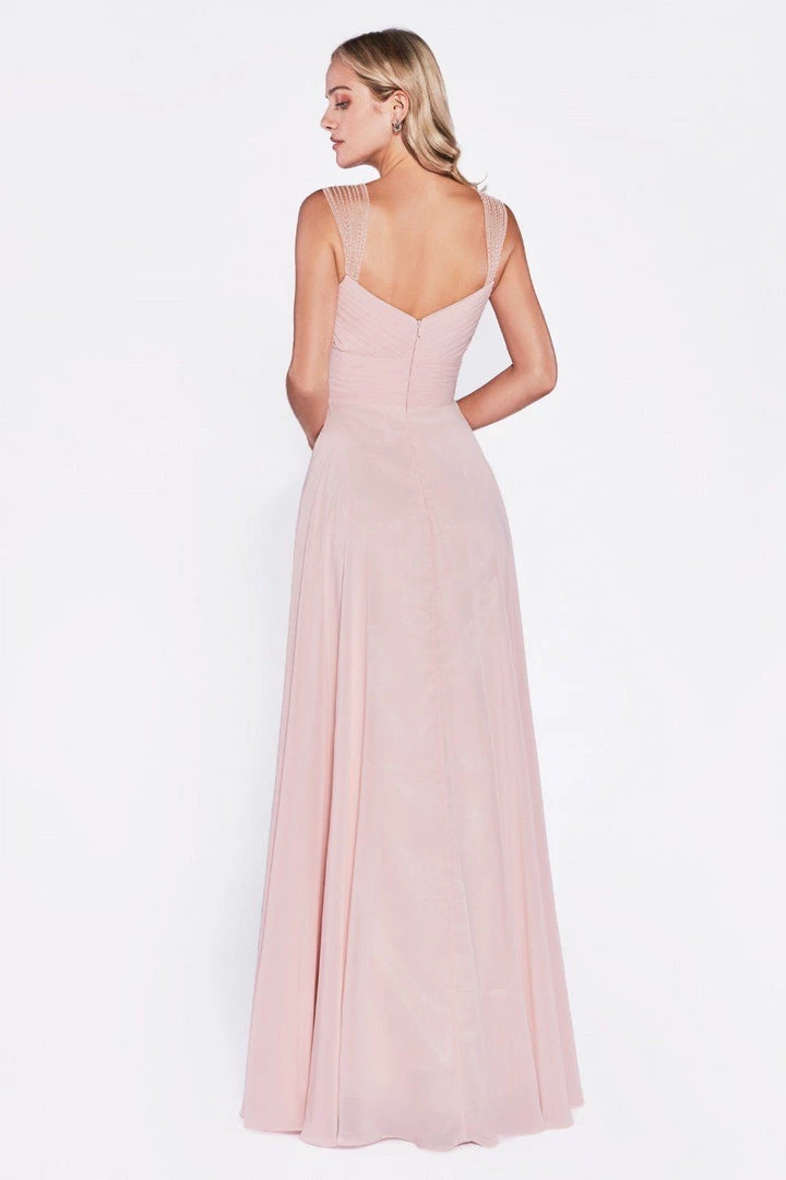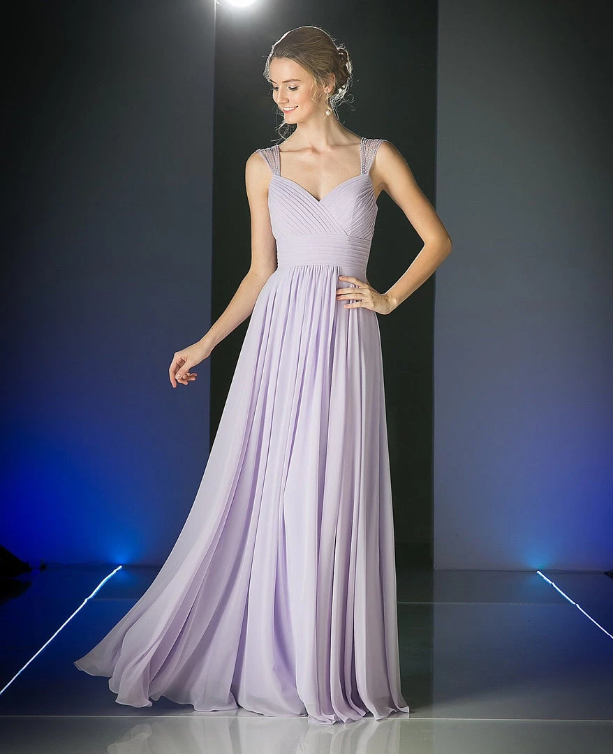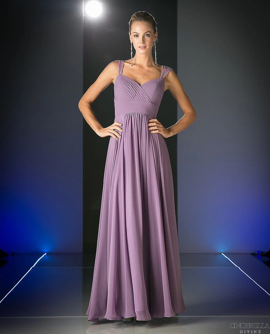 Look timeless in this long sweetheart dress with beaded cap sleeves by Cinderella Divine 7461. Beaded sheer sleeveless with shirred bodice and pleated empire waist. Gathered waistline and flowy floor length skirt adds a sense of romance.