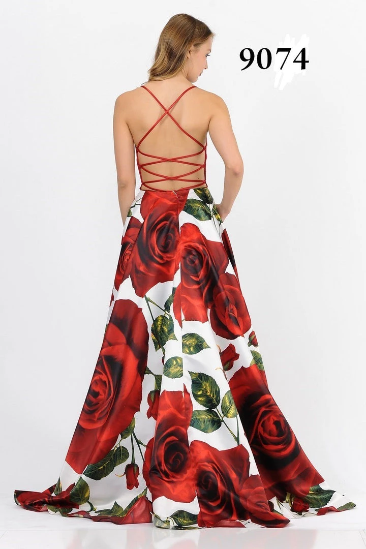 Look lovely in this long red floral print dress with strappy open back by Poly USA 9074. This beautiful formal gown features a sleeveless spaghetti strap square bodice, flirty strappy open back, side pockets, floor length A-line skirt with a vibrant floral print, and a zipper closure. Affordably priced at $220, this long evening dress is perfect for any formal event and will keep you on budget!