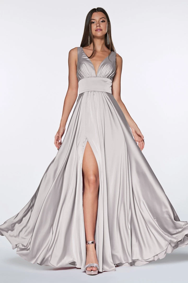 Receive lots of compliments in this long sleeveless V-neck dress with leg slit by Cinderella Divine 7469. We love this satin flowy A-line dress with leg slit, open back and V-neckline!