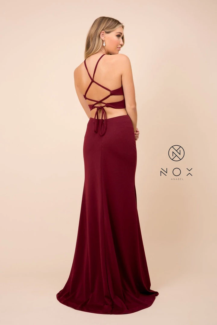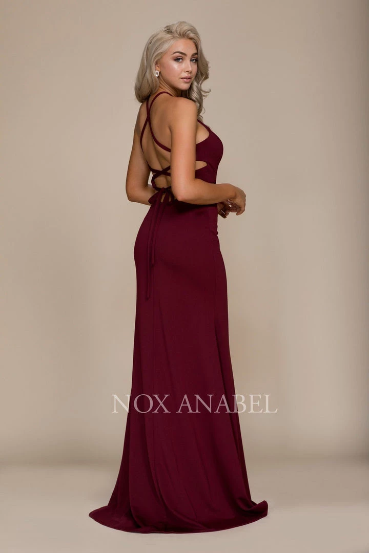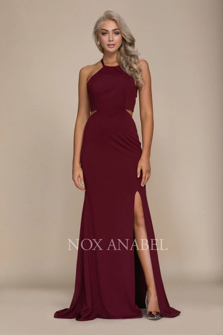 Look unforgettable in this sexy cutout gown with lace-up back by Nox Anabel C026. This form-fitting evening dress features a sleeveless high-neck bodice with side cutouts that draws attention to the waist, eye-catching open back, a full length skirt opens in a sexy side slit and ends with a floor-sweeping train, and a crisscross lace-up back. Affordably priced under $200, this dress is perfect for any formal event and will keep you on budget!