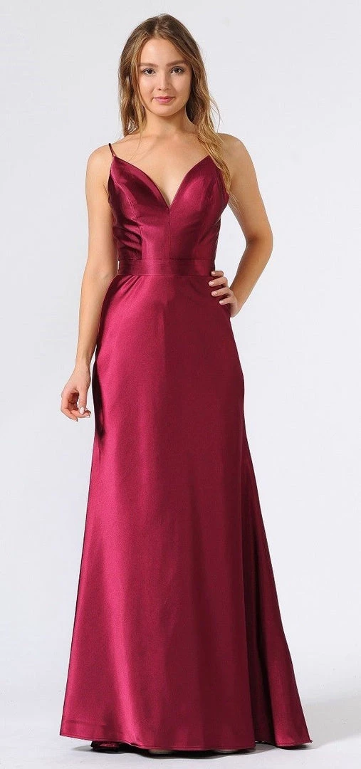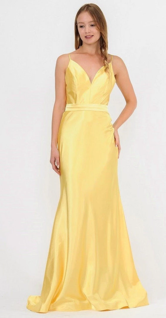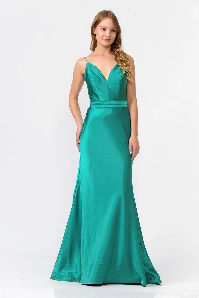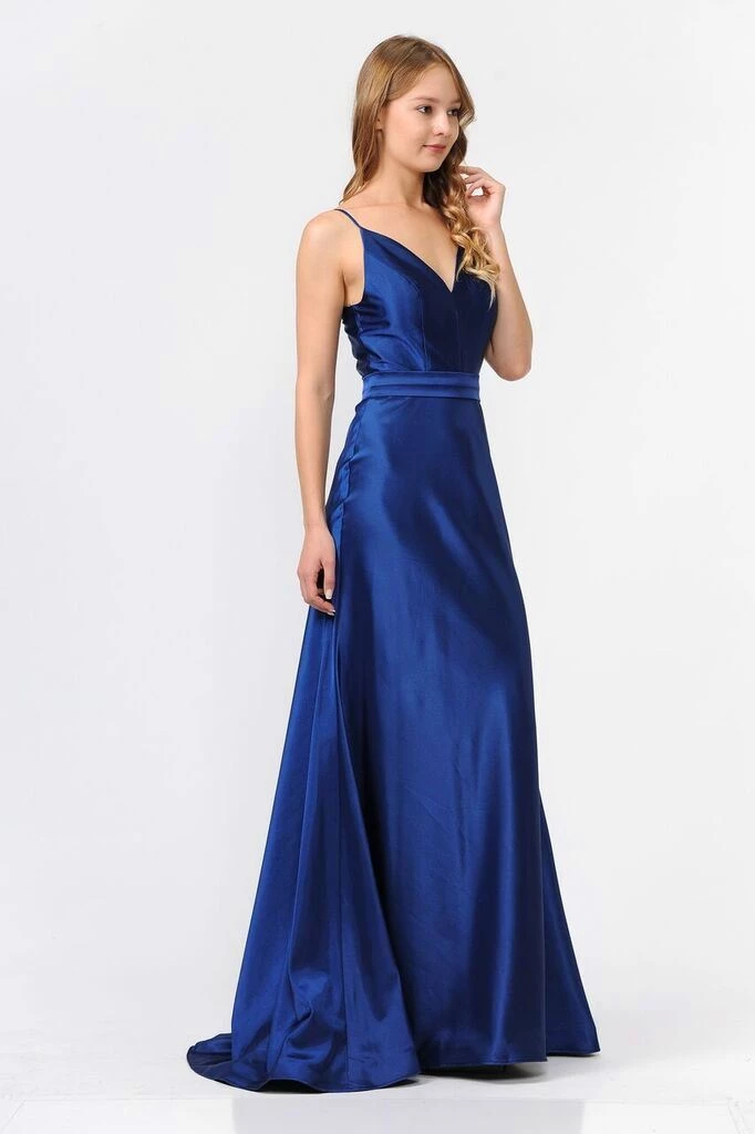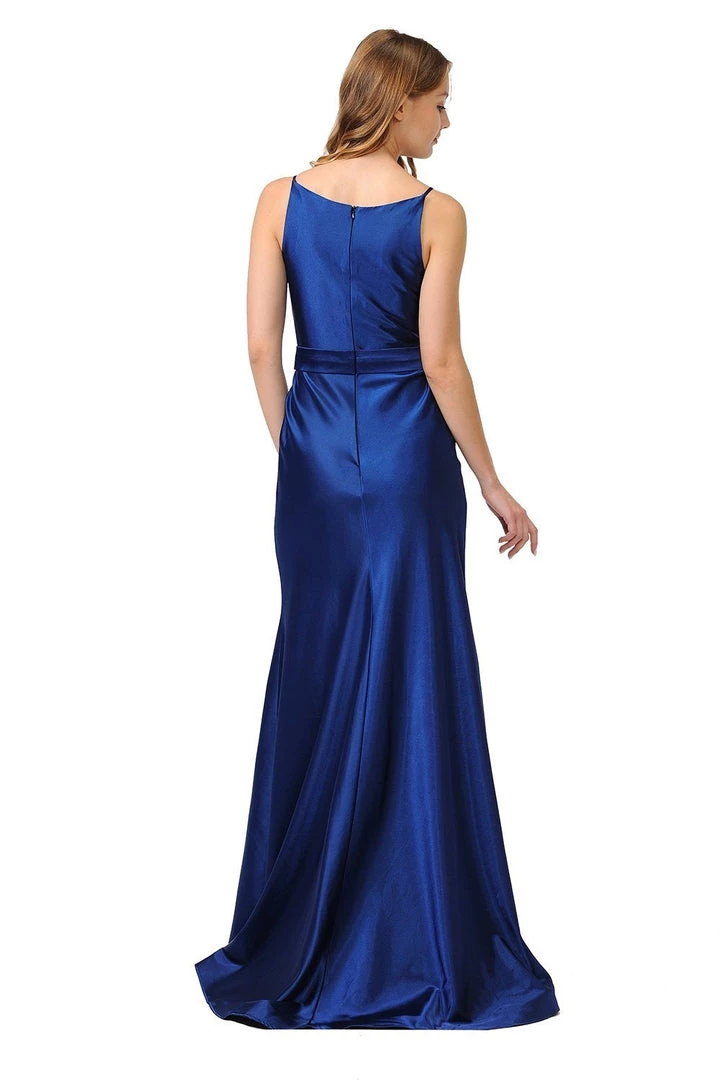 You’ll love twirling around in this long V-neck charmeuse dress by Poly USA 9028. This beautiful formal gown features a V-neckline with a waistband, enclosed back, floor length skirt with sweep train, and a zipper closure. Affordably priced under $130, this long evening dress is perfect for any formal event and will keep you on budget!
