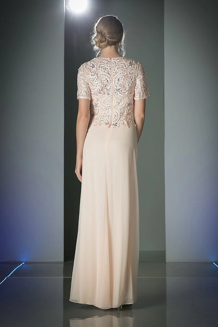 Look timeless in this beaded chiffon dress with short sleeves by Cinderella Divine 1942. A short-sleeved, sweetheart top with silk cord trim and rhinestones. A-line design perfect for a sophisticated woman.