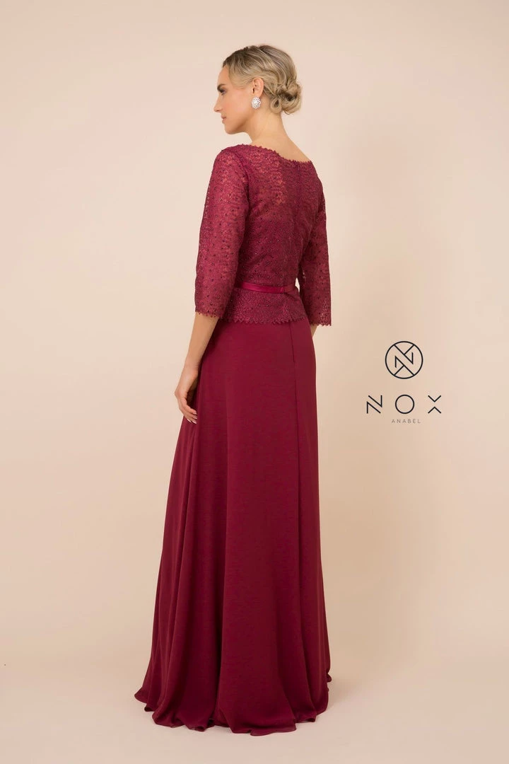 Look picture-perfect in this long lace bodice dress with sheer three-quarter length sleeves by Nox Anabel M520.