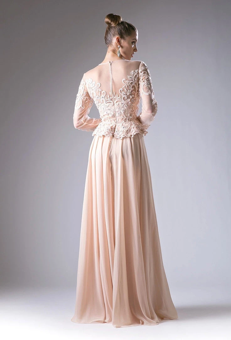 Look modest chic in this beaded lace long sleeve champagne dress with A-line skirt by Cinderella Divine CR772.