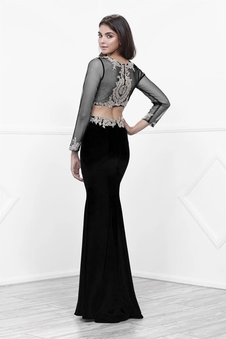 Look glamorous in this long-sleeved two-piece crop top embroidered dress by Nox Anabel Style Number 8368 at your upcoming formal event. This long evening gown features a long sleeved sheer crop-top adorned with lovely gold embroidery, the long skirt is accented with the same gold embroidery, and a zipper closure.