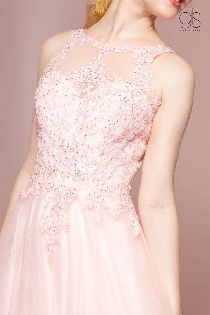 Turn heads in this long sleeveless A-line dress with sheer lace top by Elizabeth K.
