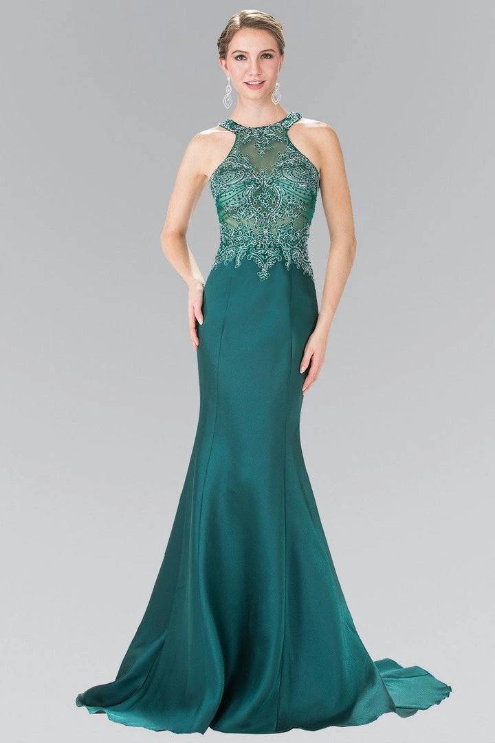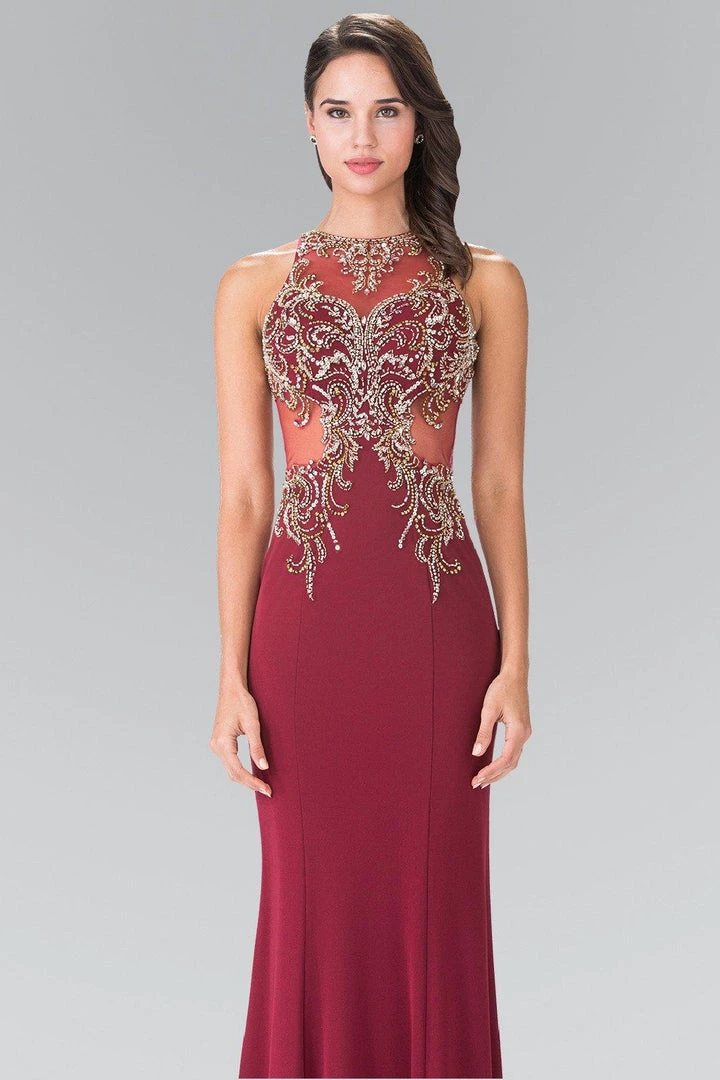 You’ll be the life of the party in this long sleeveless beaded illusion dress by Elizabeth K.