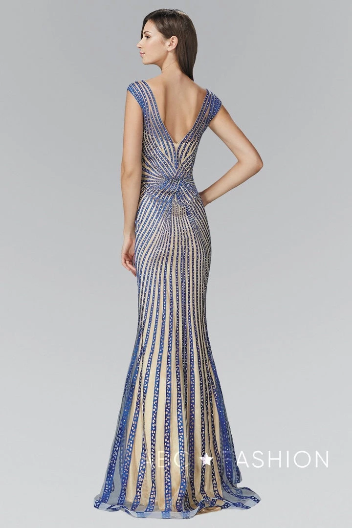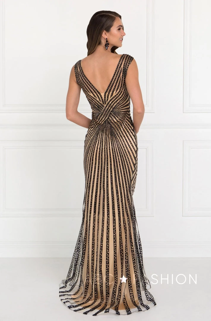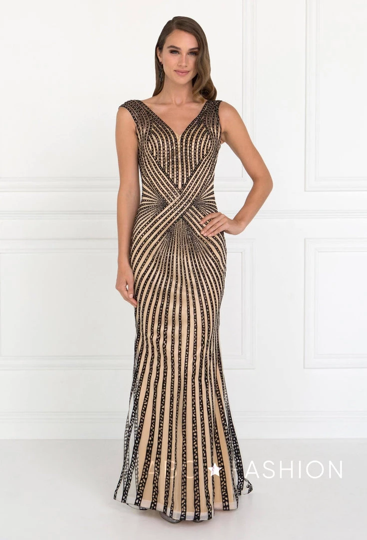 Command attention in this beaded sleeveless V-neck gown by Elizabeth K GL2053. Sleeveless full length streak dress with a V-neckline on a trumpet silhouette. Has an open back with zipper close. Rhinestone overlay on streaks with embroidery work through out on a solid one tone. Perfect for any formal event!
