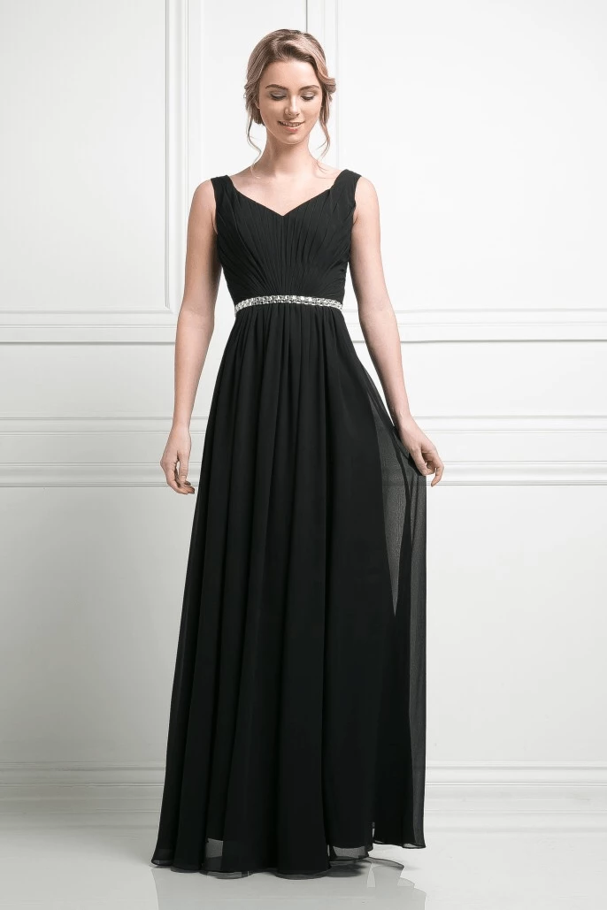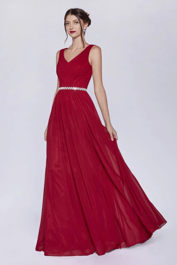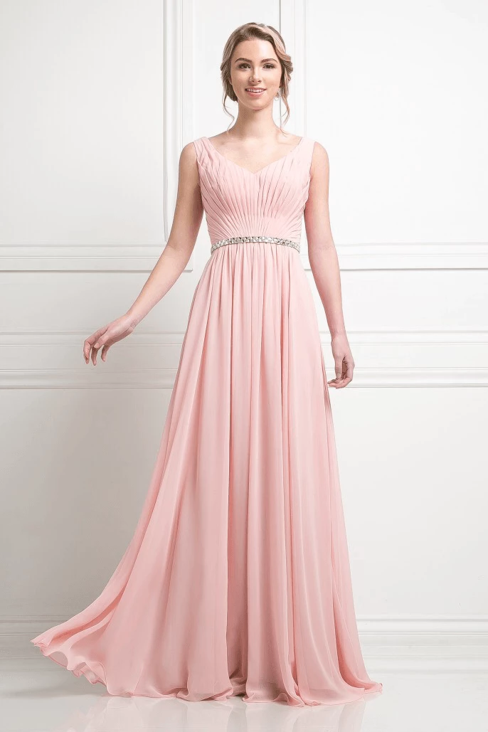 Make a grand entrance in this sleeveless pleated evening dress with belt by Cinderella Divine W0014. Simple and elegant pleated gown. The shoulder straps and bodice are pleated and cascade into a tighter pleating at the waist. The A-line waist is belted with a braided piece and separates the bodice from the long pleated chiffon skirt.