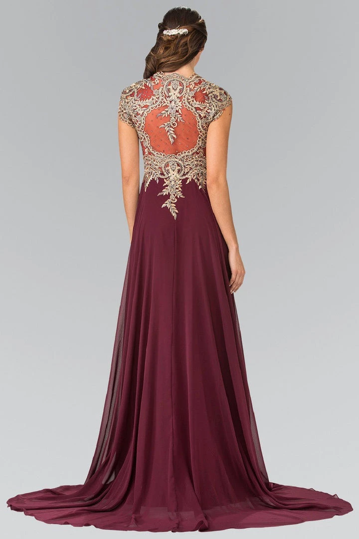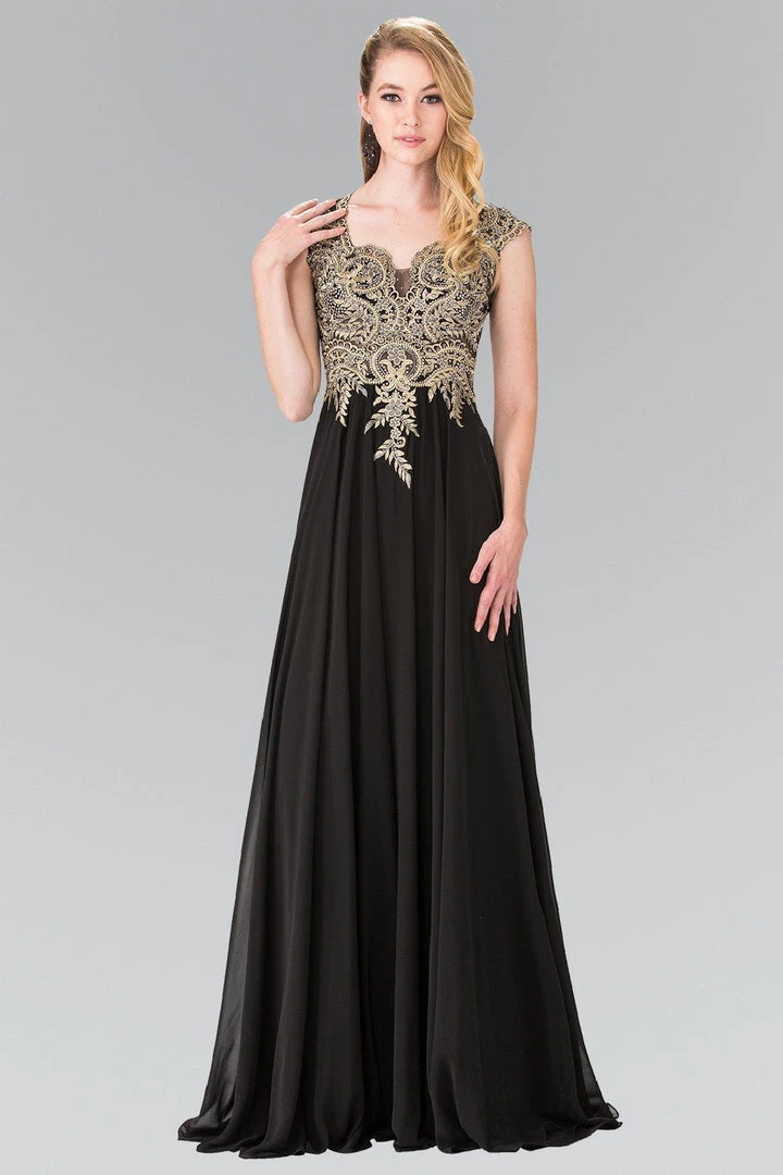 You’ll be the life of the party in this long sleeveless chiffon dress with gold lace applique by Elizabeth K GL2229. Made out of chiffon, this beautiful gown features a lovely beaded gold lace appliques, and a sheer embellished back.