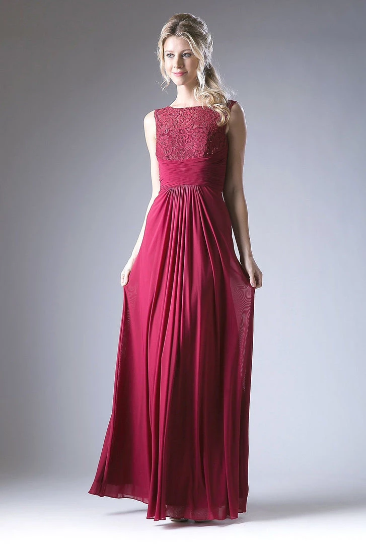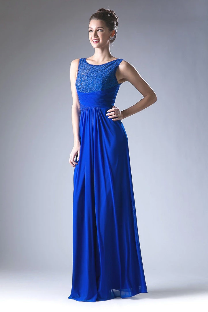 Make a grand entrance in this long sleeveless A-line dress with lace bodice by Cinderella Divine CD925.