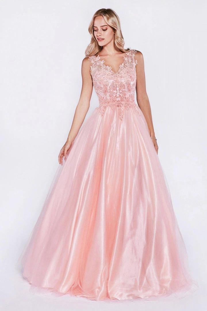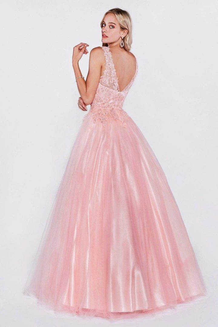 Dance the night away in this long sleeveless lace bodice dress with A-line tulle skirt by Cinderella Divine 9178.