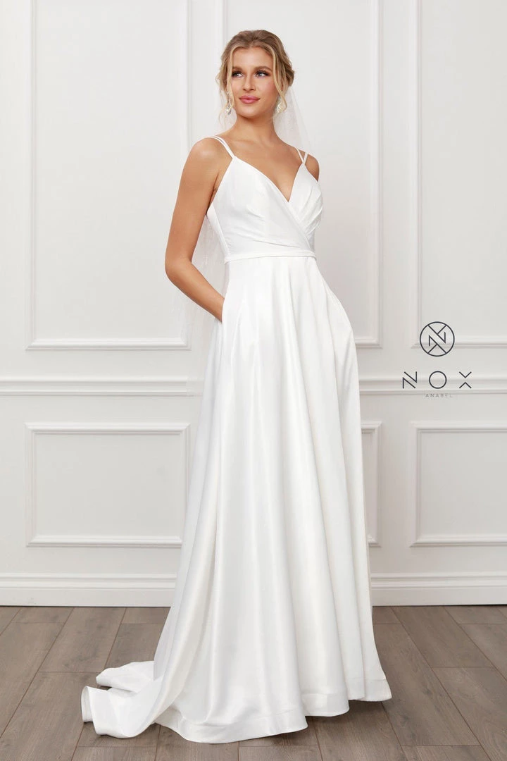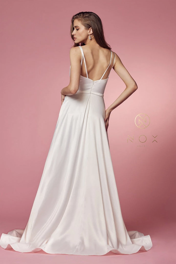 Dance the night away in this white sleeveless A-line gown by Nox Anabel E484. Made out of satin, this long sleeveless dress features a fitted V-neck bodice, open back, a floor length A-line skirt with side pockets, and a zipper closure.