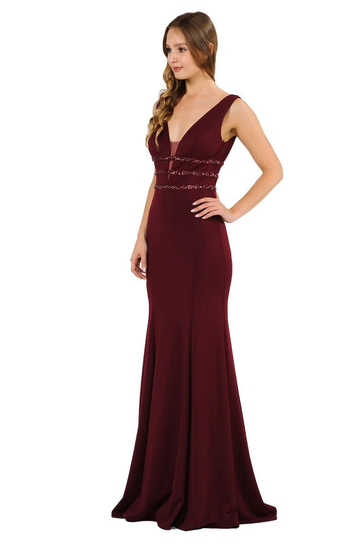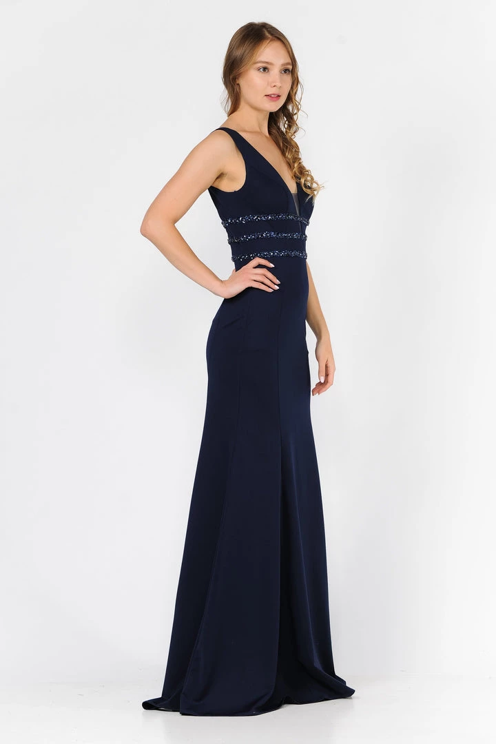 Look stunning in this long V-neck sleeveless dress with beaded bands by Poly USA 8222. This beautiful formal gown features a deep V-neckline with a sheer inset panel, sparkly beaded bands along the waist, flirty open back, floor length form-fitting A-line skirt, and a zipper closure. Affordably priced at $220, this long evening dress is perfect for any formal event and will keep you on budget!
