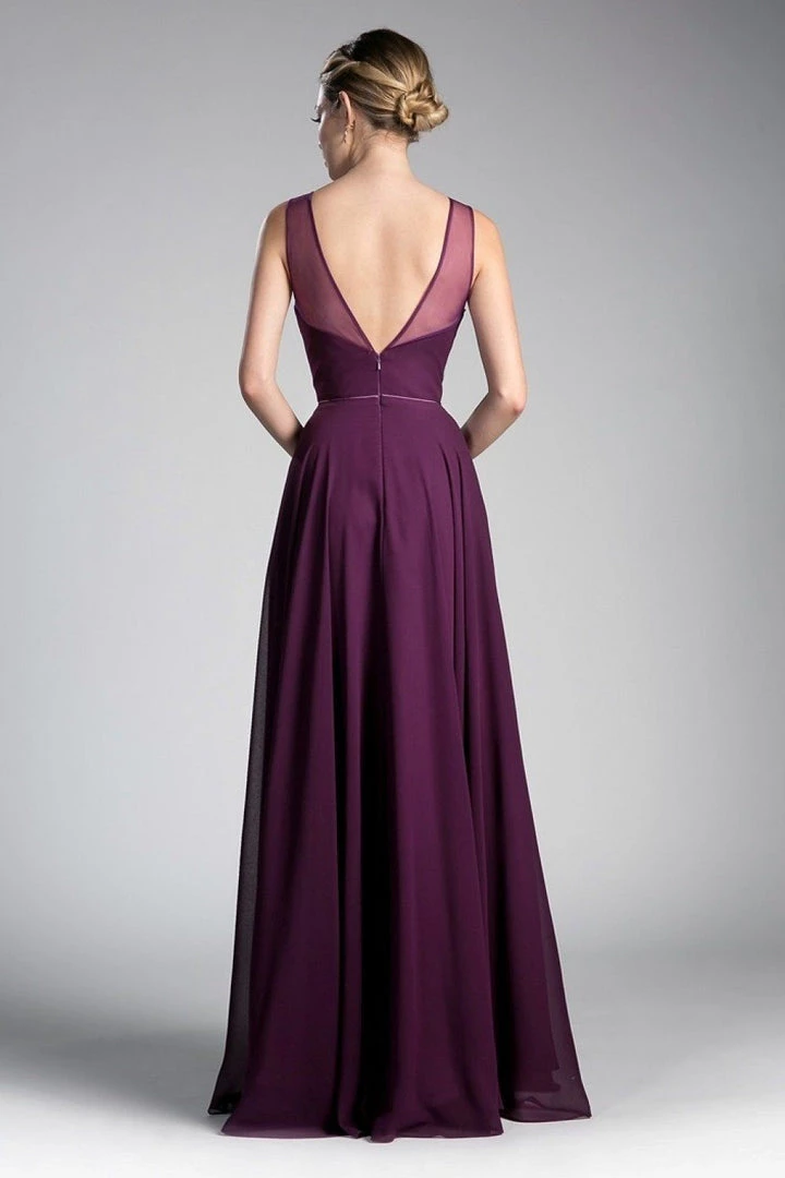 - Sleeveless A-line chiffon gown with illusion neckline and open back