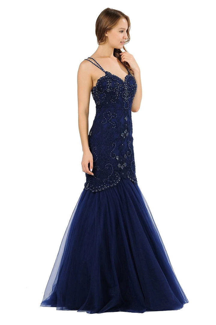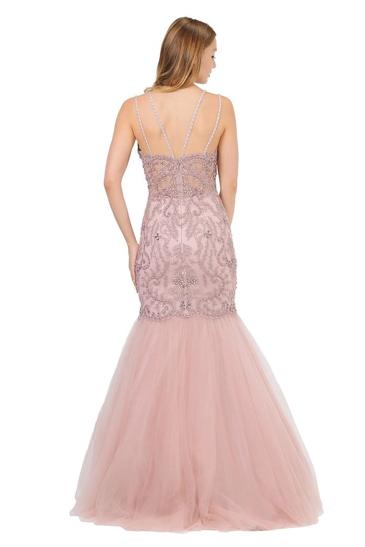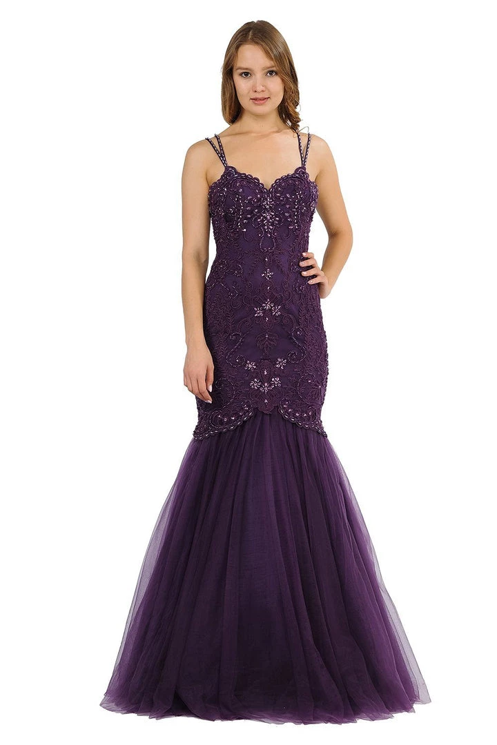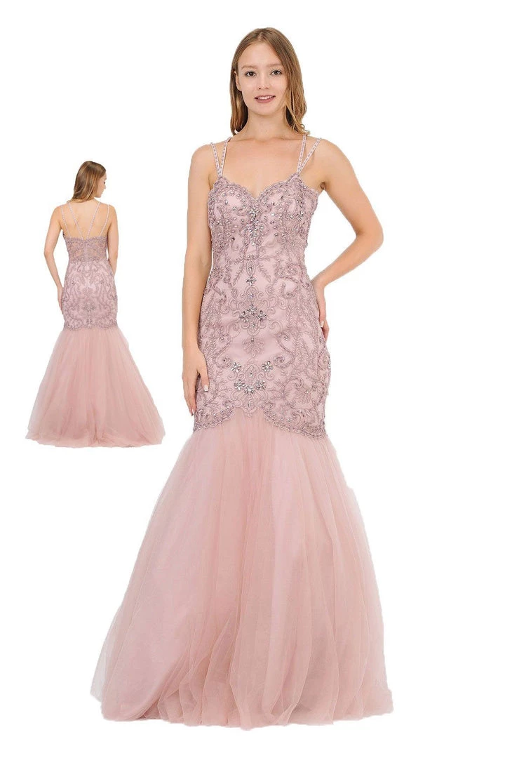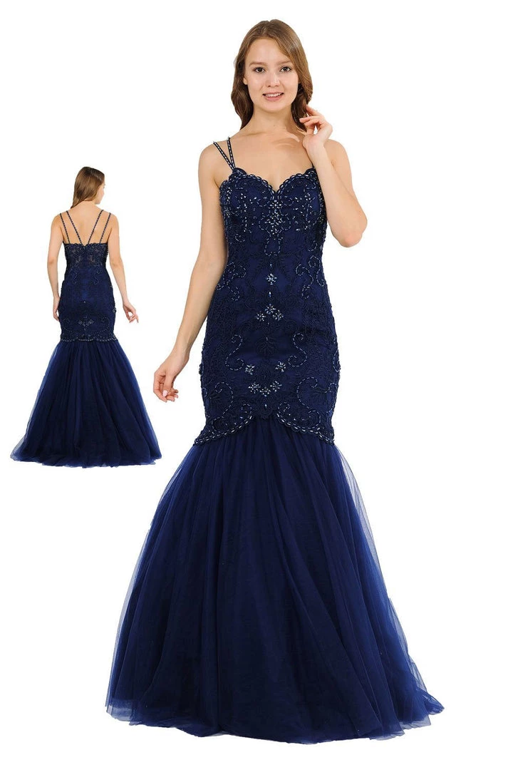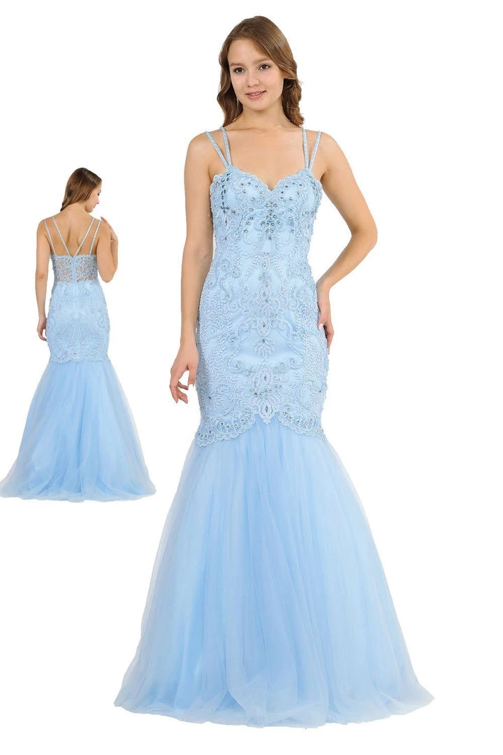 Look gorgeous from every angle in this long sweetheart mermaid dress with allover vintage-inspired embellishments by Poly USA 8352. This beautiful formal gown features a multi-strap sweetheart bodice adorned with vintage-inspired embroidery accented with beads and rhinestones, sheer embroidered back, floor length trumpet tulle skirt, and a zipper closure. Affordably priced under $300, this long evening dress is perfect for any formal event and will keep you on budget!